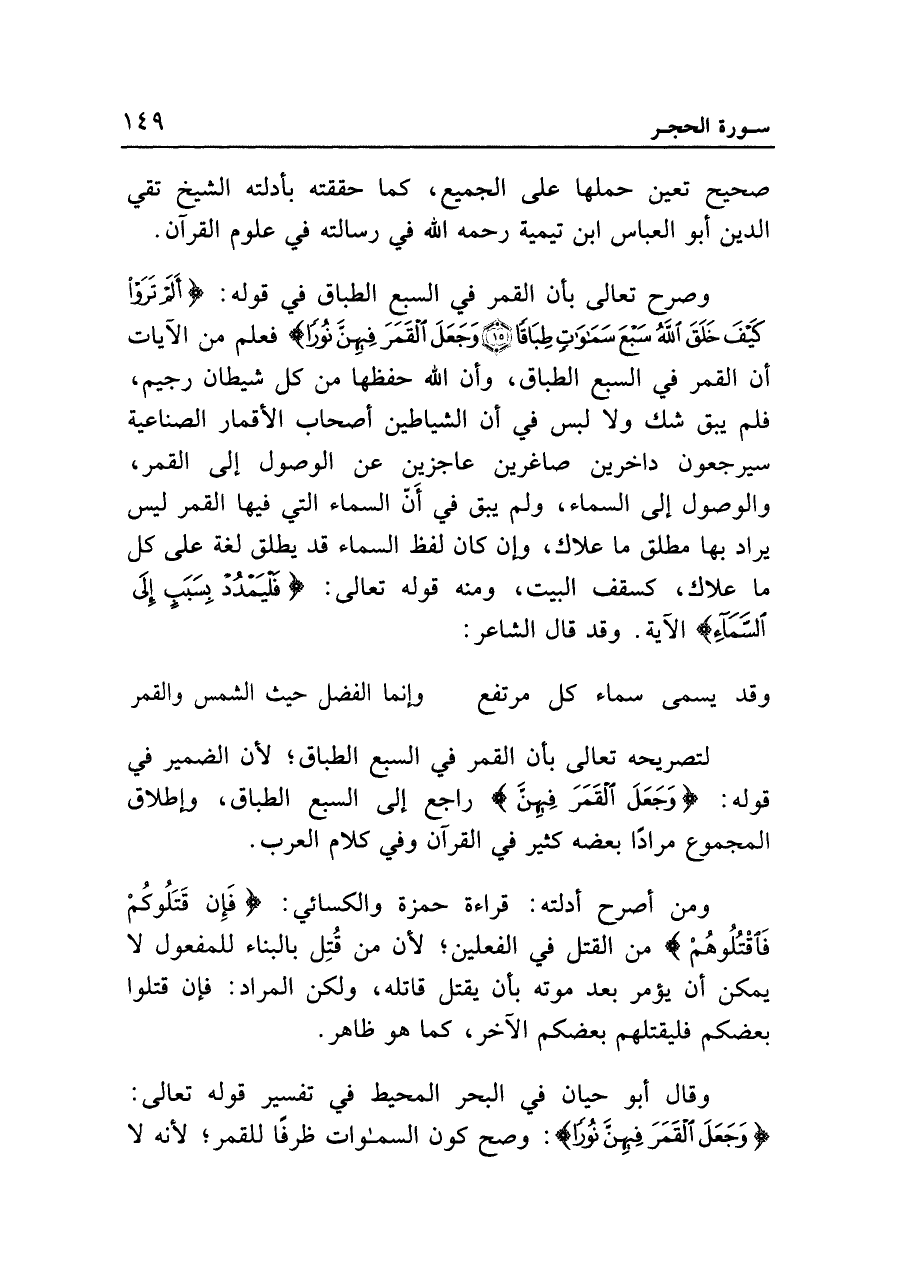 وقال أَبو حيان في البحر المحيط في تفسير قوله تعالى: {وَجَعَلَ الْقَمَرَ فِيْهِنَّ نُوْرًا}: وصح كون السموات ظرفًا للقمر؛ لأنه لا