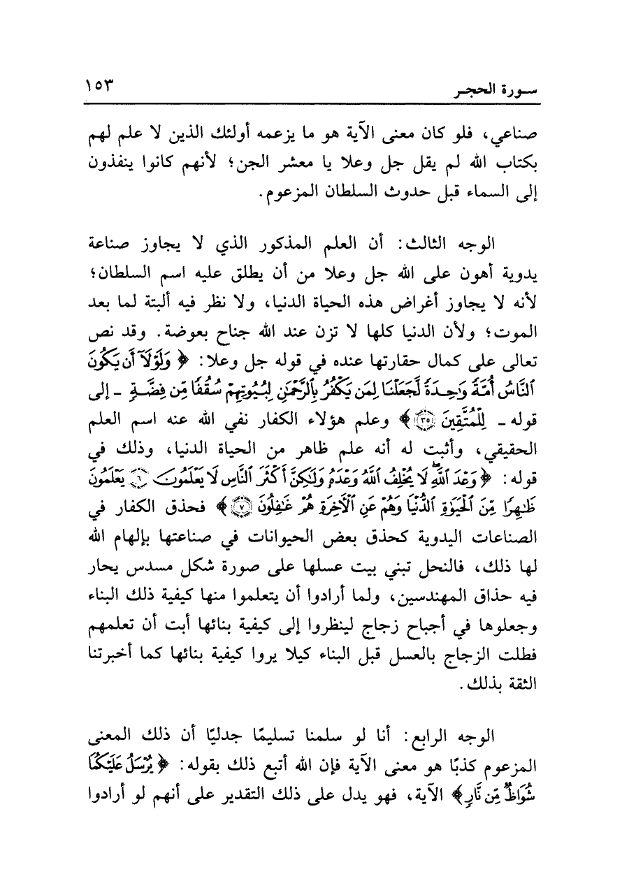 الوجه الثالث: أن العلم المذكور الذي لا يجاوز صناعة يدوية أهون على الله جل وعلا من أن يطلق عليه اسم السلطان؛ لأنه لا يجاوز أغراض هذه الحياة الدنيا، ولا نظر فيه ألبتة لما بعد الموت؛ ولأن الدنيا كلها لا تزن عند الله جناح بعوضة. وقد نص تعالى على كمال حقارتها عنده في قوله جل وعلا: {وَلَوْلَا أَنْ يَكُونَ النَّاسُ أُمَّةً وَاحِدَةً لَجَعَلْنَا لِمَنْ يَكْفُرُ بِالرَّحْمَنِ لِبُيُوتِهِمْ سُقُفًا مِنْ فِضَّةٍ -إلى قوله- لِلْمُتَّقِينَ (٣٥)} وعلم هؤلاء الكفار نفي الله عنه اسم العلم الحقيقي، وأثبت له أنَّه علم ظاهر من الحياة الدنيا، وذلك في قوله: {وَعْدَ اللَّهِ لَا يُخْلِفُ اللَّهُ وَعْدَهُ وَلَكِنَّ أَكْثَرَ النَّاسِ لَا يَعْلَمُونَ (٦) يَعْلَمُونَ ظَاهِرًا مِنَ الْحَيَاةِ الدُّنْيَا وَهُمْ عَنِ الْآخِرَةِ هُمْ غَافِلُونَ (٧)} فحذق الكفار في الصناعات اليدوية كحذق بعض الحيوانات في صناعتها بإلهام الله لها ذلك، فالنحل تبني بيت عسلها على صورة شكل مسدس يحار فيه حذاق المهندسين، ولما أرادوا أن يتعلموا منها كيفية ذلك البناء وجعلوها في أجباح زجاج لينظروا إلى كيفية بنائها أبت أن تعلمهم فطلت الزجاج بالعسل قبل البناء كيلا يروا كيفية بنائها كما أخبرتنا الثقة بذلك.