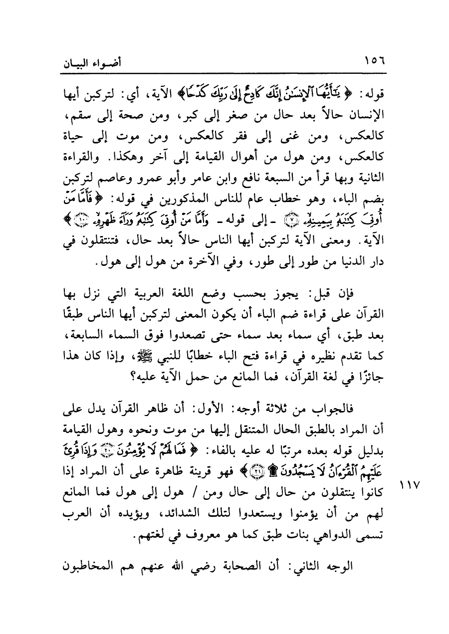 قوله: {يَاأَيُّهَا الْإِنْسَانُ إِنَّكَ كَادِحٌ إِلَى رَبِّكَ كَدْحًا} الآية، أي: لتركبن أيها الإنسان حالًا بعد حال من صغر إلى كبر، ومن صحة إلى سقم، كالعكس، ومن غنى إلى فقر كالعكس، ومن موت إلى حياة كالعكس، ومن هول من أهوال القيامة إلى آخر وهكذا. والقراءة الثانية وبها قرأ من السبعة نافع وابن عامر وأَبو عمرو وعاصم لتركبن بضم الباء، وهو خطاب عام للناس المذكورين في قوله: {فَأَمَّا مَنْ أُوتِيَ كِتَابَهُ بِيَمِينِهِ (٧)} إلى قوله {وَأَمَّا مَنْ أُوتِيَ كِتَابَهُ وَرَاءَ ظَهْرِهِ (١٠)} الآية. ومعنى الآية لتركبن أيها الناس حالًا بعد حال، فتنتقلون في دار الدنيا من طور إلى طور، وفي الآخرة من هول إلى هول.