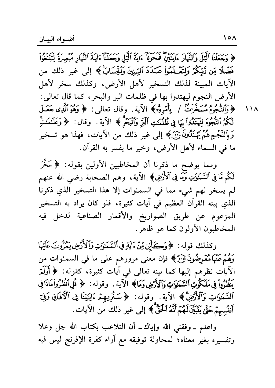 {وَجَعَلْنَا اللَّيْلَ وَالنَّهَارَ آيَتَيْنِ فَمَحَوْنَا آيَةَ اللَّيْلِ وَجَعَلْنَا آيَةَ النَّهَارِ مُبْصِرَةً لِتَبْتَغُوا فَضْلًا مِنْ رَبِّكُمْ وَلِتَعْلَمُوا عَدَدَ السِّنِينَ وَالْحِسَابَ} إلى غير ذلك من الآيات المبينة لذلك التسخير لأهل الأرض، وكذلك سخر لأهل الأرض النجومِ ليهتدوا بها في ظلمات البر والبحر، كما قال تعالى: {وَالنُّجُومَ مُسَخَّرَاتٍ بِأَمْرِهِ} الآية. وقال تعالى: {وَهُوَ الَّذِي جَعَلَ لَكُمُ النُّجُومَ لِتَهْتَدُوا بِهَا فِي ظُلُمَاتِ الْبَرِّ وَالْبَحْرِ} الآية. وقال: {وَعَلَامَاتٍ وَبِالنَّجْمِ هُمْ يَهْتَدُونَ (١٦)} إلى غير ذلك من الآيات، فهذا هو تسخير ما فى السماء لأهل الأرض، وخير ما يفسر به القرآن.
