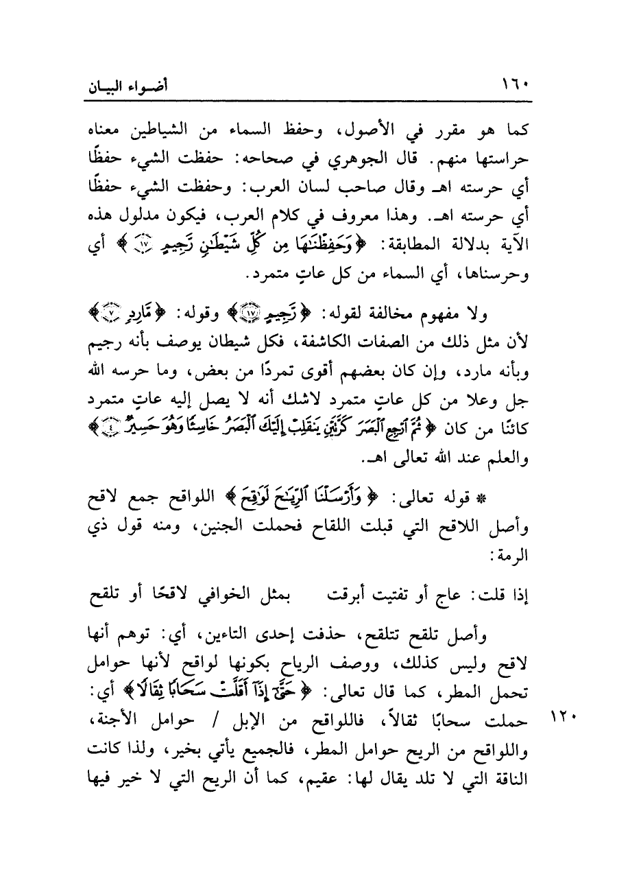 كما هو مقرر في الأصول، وحفظ السماء من الشياطين معناه حراستها منهم. قال الجوهري في صحاحه: حفظت الشيء حفظًا أي حرسته اه وقال صاحب لسان العرب: وحفظت الشيء حفظًا أي حرسته اه. وهذا معروف في كلام العرب، فيكون مدلول هذه الآية بدلالة المطابقة: {وَحَفِظْنَاهَا مِنْ كُلِّ شَيْطَانٍ رَجِيمٍ (١٧)} أي وحرسناها، أي السماء من كل عاتٍ متمرد.