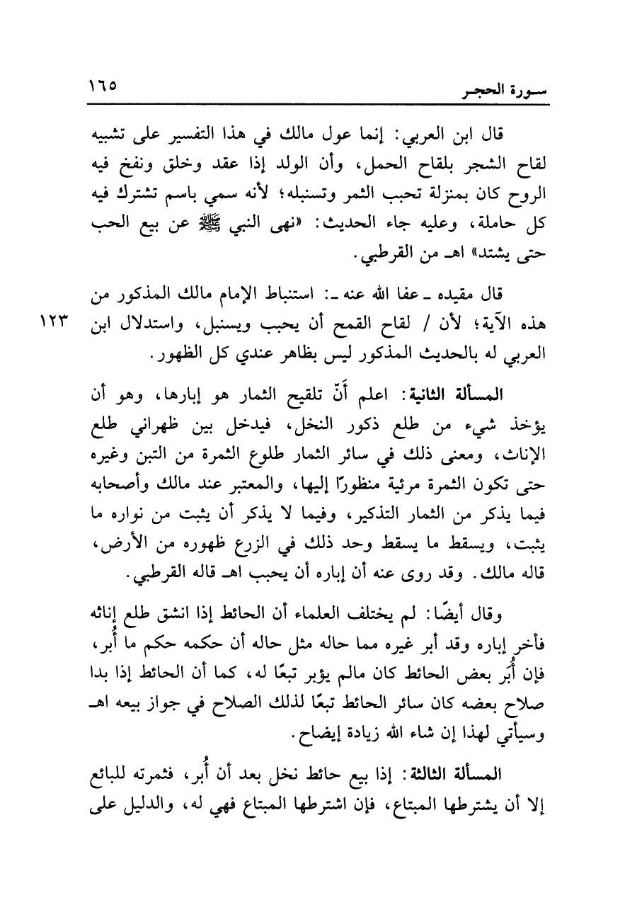 قال مقيده -عفا الله عنه-: استنباط الإمام مالك المذكور من هذه الآية؛ لأن لقاح القمح أن يحبب ويسنبل، واستدلال ابن العربي له بالحديث المذكور ليس بظاهر عندي كل الظهور.