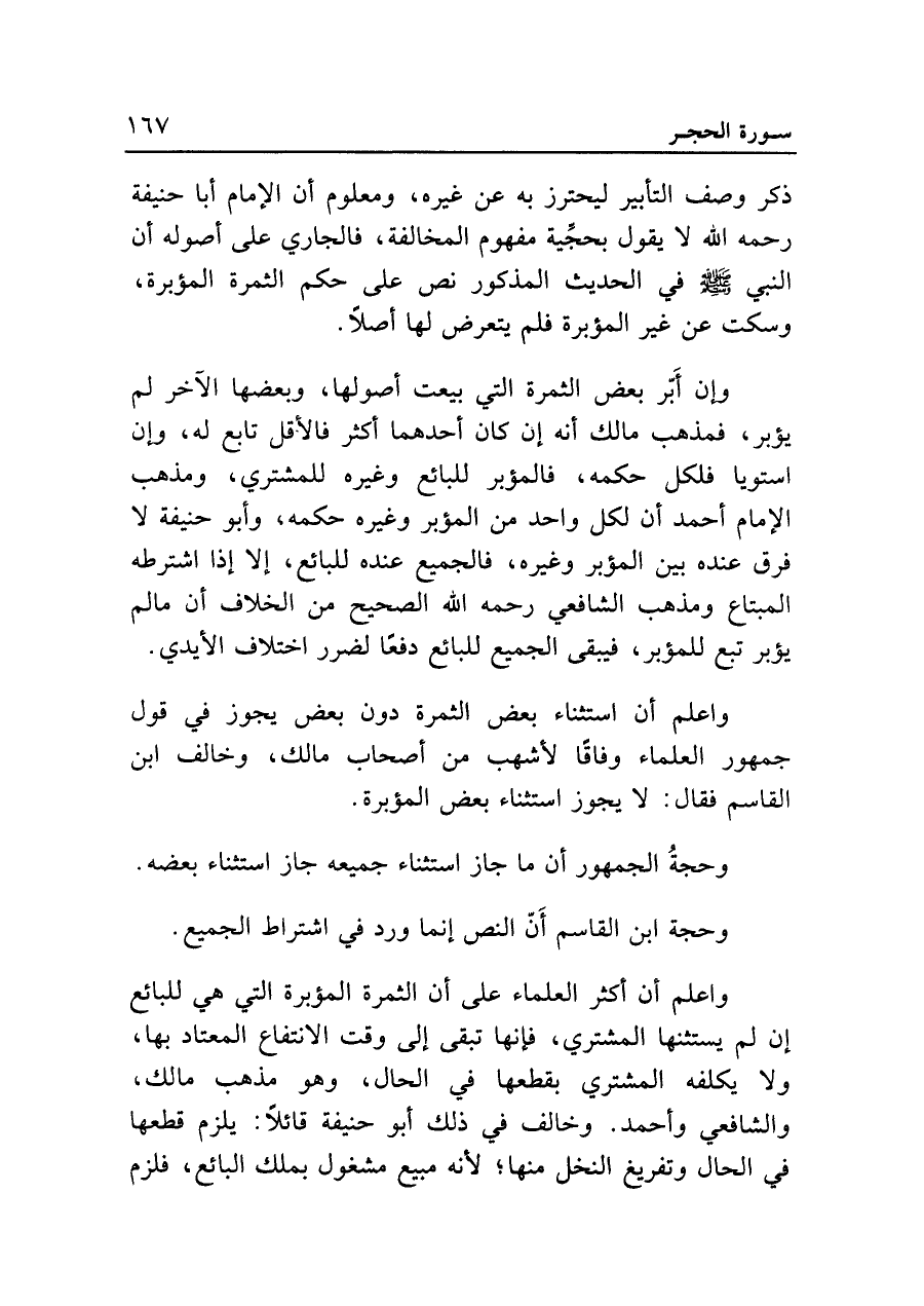 واعلم أن استثناء بعض الثمرة دون بعض يجوز في قول جمهور العلماء وفاقًا لأشهب من أصحاب مالك، وخالف ابن القاسم فقال: لا يجوز استثناء بعض المؤبرة.