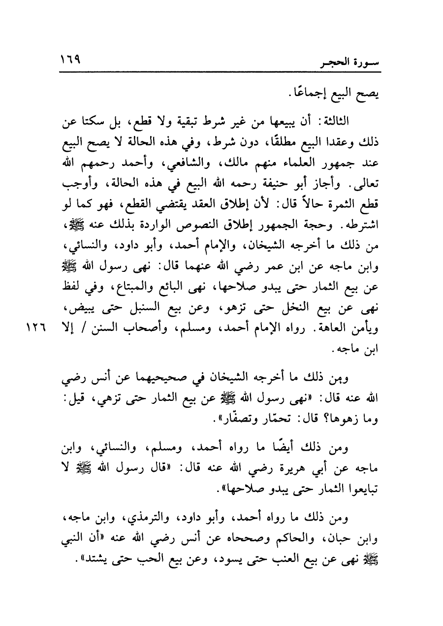 الثالثة: أن يبيعها من غير شرط تبقية ولا قطع، بل سكتا عن ذلك وعقدا البيع مطلقًا، دون شرط، وفي هذه الحالة لا يصح البيع عند جمهور العلماء منهم مالك، والشافعي، وأحمد رحمهم الله تعالى. وأجاز أبو حنيفة رحمه الله البيع في هذه الحالة، وأوجب قطع الثمرة حالًا قال: لأن إطلاق العقد يقتضي القطع، فهو كما لو اشترطه. وحجة الجمهور إطلاق النصوص الواردة بذلك عنه - صلى الله عليه وسلم -، من ذلك ما أخرجه الشيخان، والإمام أحمد، وأبو داود، والنسائي، وابن ماجه عن ابن عمر رضي الله عنهما قال: نهى رسول الله - صلى الله عليه وسلم - عن بيع الثمار حتى يبدو صلاحها، نهى البائع والمبتاع، وفي لفظ نهى عن بيع النخل حتى تزهو، وعن بيع السنبل حتى يبيض، ويأمن العاهة. رواه الإمام أحمد، ومسلم، وأصحاب السنن إلا ابن ماجه.