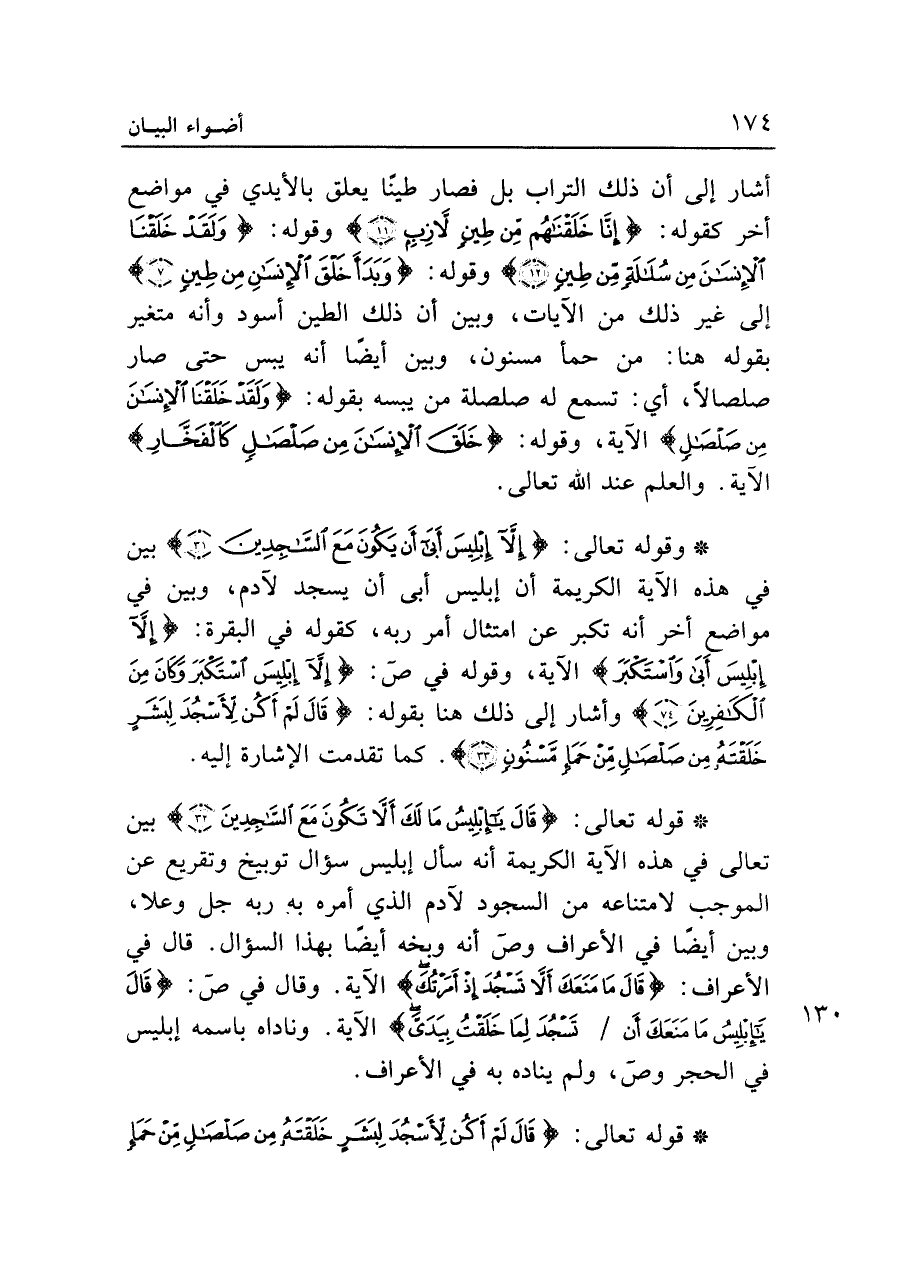 • وقوله تعالى: {إِلَّا إِبْلِيسَ أَبَى أَنْ يَكُونَ مَعَ السَّاجِدِينَ (٣١)} بين في هذه الآية الكريمة أن إبليس أبى أن يسجد لآدم، وبين في مواضع آخر أنه تكبر عن امتثال أمر ربه، كقوله في البقرة: {إِلَّا إِبْلِيسَ أَبَى وَاسْتَكْبَرَ} الآية، وقوله في صَ: {إِلَّا إِبْلِيسَ اسْتَكْبَرَ وَكَانَ مِنَ الْكَافِرِينَ (٧٤)} وأشار إلى ذلك هنا بقوله: {قَالَ لَمْ أَكُنْ لِأَسْجُدَ لِبَشَرٍ خَلَقْتَهُ مِنْ صَلْصَالٍ مِنْ حَمَإٍ مَسْنُونٍ (٣٣)}. كما تقدمت الإشارة إليه.