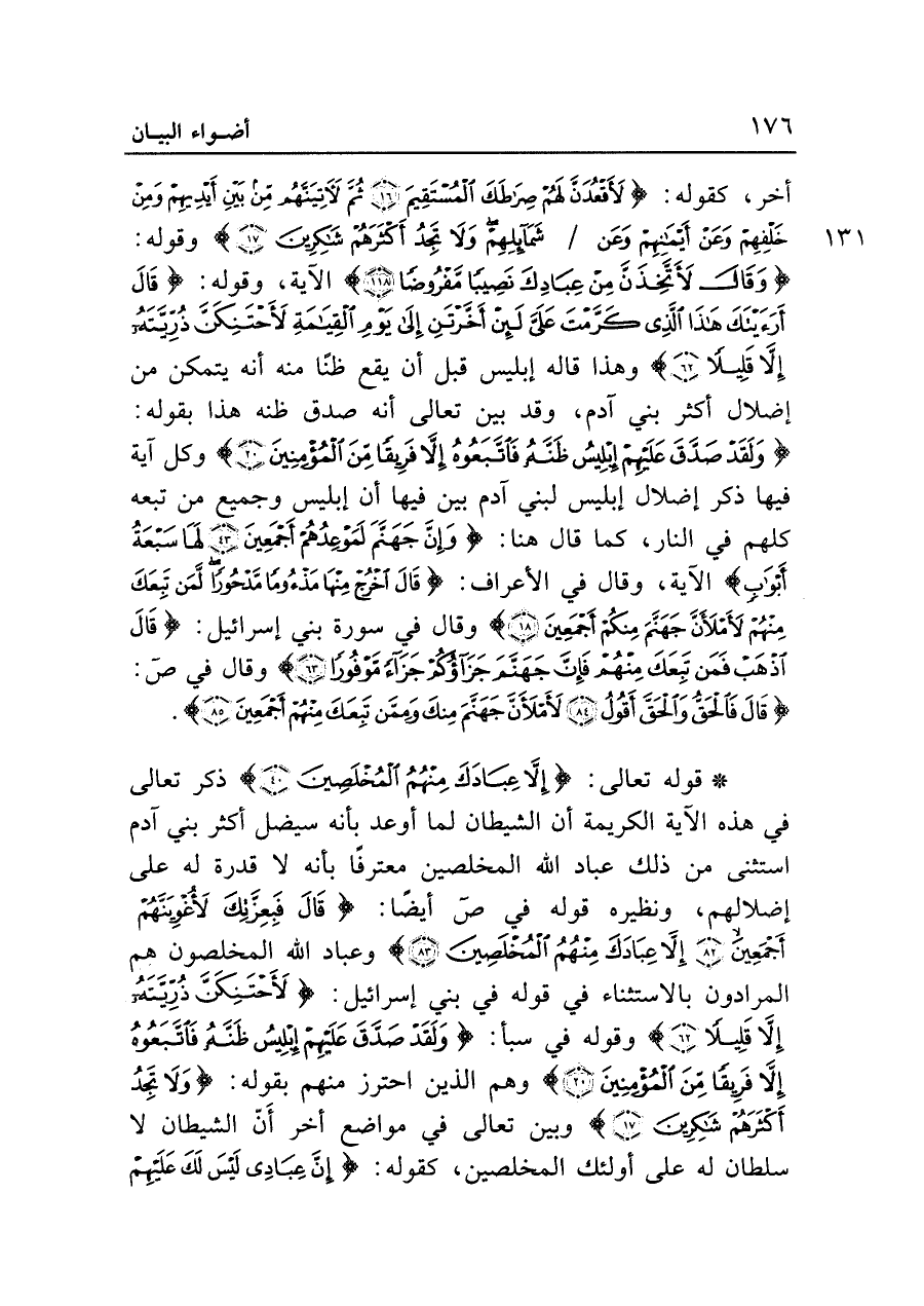 • قوله تعالى: {إِلَّا عِبَادَكَ مِنْهُمُ الْمُخْلَصِينَ (٨٣)} ذكر تعالى في هذه الآية الكريمة أن الشيطان لما أوعد بأنه سيضل أكثر بني آدم استثنى من ذلك عباد الله المخلصين معترفًا بأنه لا قدرة له على إضلالهم، ونظيره قوله في ص أيضًا: {قَالَ فَبِعِزَّتِكَ لَأُغْوِيَنَّهُمْ أَجْمَعِينَ (٨٢) إِلَّا عِبَادَكَ مِنْهُمُ الْمُخْلَصِينَ (٨٣)} وعباد الله المخلصون هم المرادون بالاستثناء في قوله في بني إسرائيل: {لَأَحْتَنِكَنَّ ذُرِّيَّتَهُ إِلَّا قَلِيلًا (٦٢)} وقوله في سبأ: {وَلَقَدْ صَدَّقَ عَلَيْهِمْ إِبْلِيسُ ظَنَّهُ فَاتَّبَعُوهُ إِلَّا فَرِيقًا مِنَ الْمُؤْمِنِينَ (٢٠)} وهم الذين احترز منهم بقوله: {وَلَا تَجِدُ أَكْثَرَهُمْ شَاكِرِينَ (١٧)} وبين تعالى في مواضع آخر أَنّ الشيطان لا سلطان له على أولئك المخلصين، كقوله: {إِنَّ عِبَادِي لَيْسَ لَكَ عَلَيْهِمْ