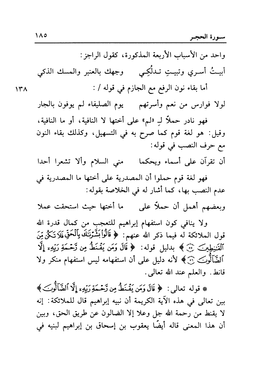 • قوله تعالى: {قَالَ وَمَنْ يَقْنَطُ مِنْ رَحْمَةِ رَبِّهِ إِلَّا الضَّالُّونَ} بين تعالى في هذه الآية الكريمة أن نبيه إبراهيم قال للملائكة: إنه لا يقنط من رحمة الله جل وعلا إلا الضالون عن طريق الحق، وبين أن هذا المعنى قاله أيضًا يعقوب بن إسحاق بن إبراهيم لبنيه في