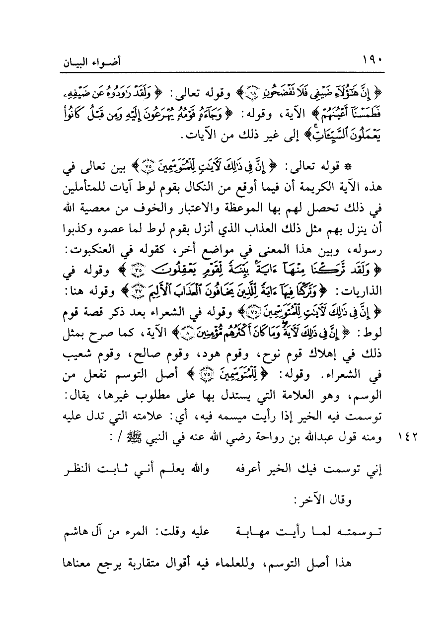 • قوله تعالى: {إِنَّ فِي ذَلِكَ لَآيَاتٍ لِلْمُتَوَسِّمِينَ (٧٥)} بين تعالى في هذه الآية الكريمة أن فيما أوقع من النكال بقوم لوط آيات للمتأملين في ذلك تحصل لهم بها الموعظة والاعتبار والخوف من معصية الله أن ينزل بهم مثل ذلك العذاب الذي أنزل بقوم لوط لما عصوه وكذبوا رسوله، وبين هذا المعنى في مواضع آخر، كقوله في العنكبوت: {وَلَقَدْ تَرَكْنَا مِنْهَا آيَةً بَيِّنَةً لِقَوْمٍ يَعْقِلُونَ (٣٥)} وقوله في الذاريات: {وَتَرَكْنَا فِيهَا آيَةً لِلَّذِينَ يَخَافُونَ الْعَذَابَ الْأَلِيمَ (٣٧)} وقوله هنا: {إِنَّ فِي ذَلِكَ لَآيَاتٍ لِلْمُتَوَسِّمِينَ (٧٥)} وقوله في الشعراء بعد ذكر قصة قوم لوط: {إِنَّ فِي ذَلِكَ لَآيَةً وَمَا كَانَ أَكْثَرُهُمْ مُؤْمِنِينَ (٨)} الآية، كما صرح بمثل ذلك في إهلاك قوم نوح، وقوم هود، وقوم صالح، وقوم شعيب في الشعراء. وقوله: {لِلْمُتَوَسِّمِينَ (٧٥)} أصل التوسم تفعل من الوسم، وهو العلامة التي يستدل بها على مطلوب غيرها، يقال: توسمت فيه الخير إذا رأيت ميسمه فيه، أي: علامته التي تدل عليه ومنه قول عبد الله بن رواحة رضي الله عنه في النبي - صلى الله عليه وسلم -: