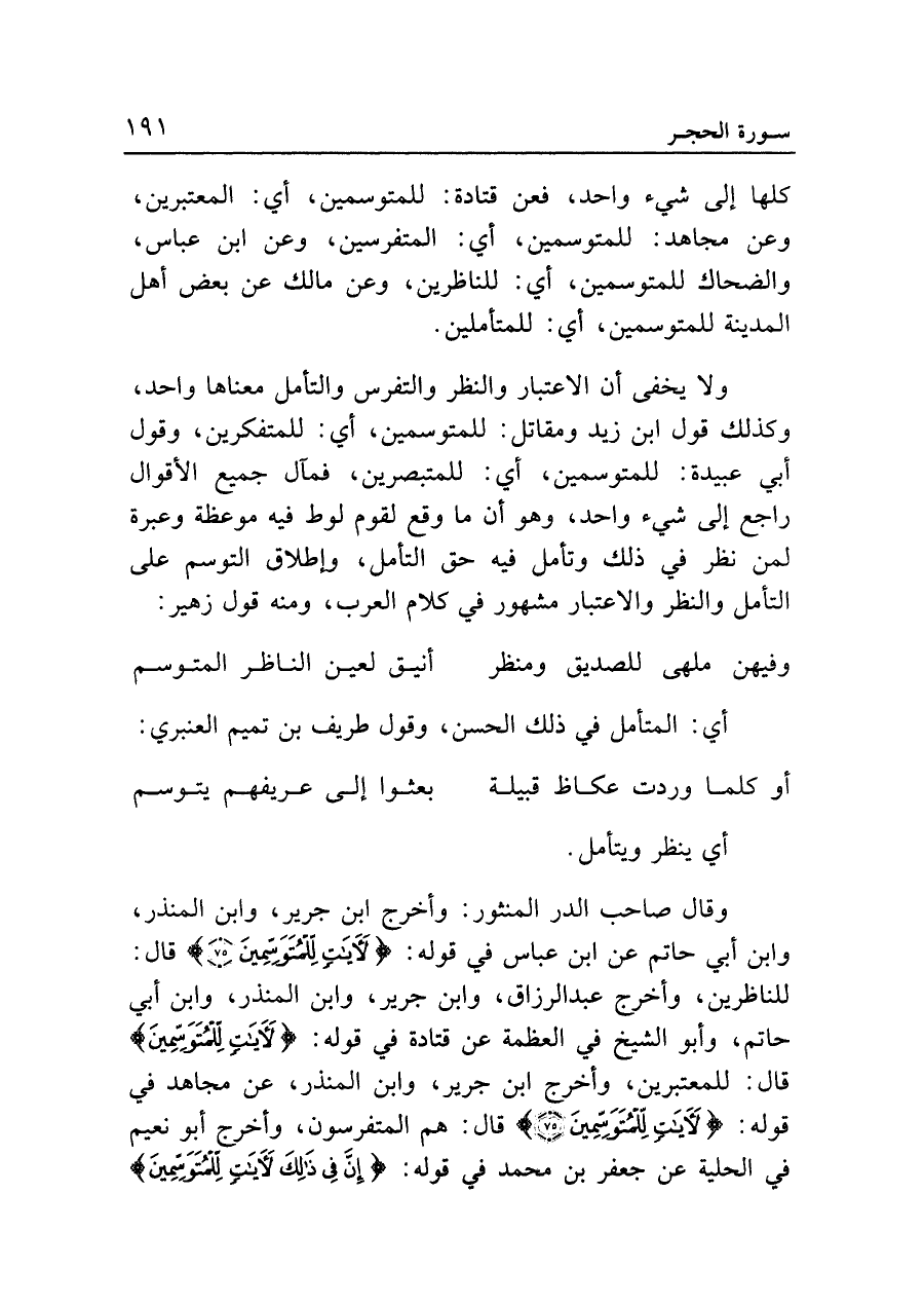 وقال صاحب الدر المنثور: وأخرج ابن جرير، وابن المنذر، وابن أبي حاتم عن ابن عباس في قوله: {لَآيَاتٍ لِلْمُتَوَسِّمِينَ (٧٥)} قال: للناظرين، وأخرج عبد الرزاق، وابن جرير، وابن المنذر، وابن أبي حاتم، وأبو الشيخ في العظمة عن قتادة في قوله: {لَآيَاتٍ لِلْمُتَوَسِّمِينَ} قال: للمعتبرين، وأخرج ابن جرير، وابن المنذر، عن مجاهد في قوله: {لَآيَاتٍ لِلْمُتَوَسِّمِينَ (٧٥)} قال: هم المتفرسون، وأخرج أبو نعيم في الحلية عن جعفر بن محمد في قوله: {إِنَّ فِي ذَلِكَ لَآيَاتٍ لِلْمُتَوَسِّمِينَ}