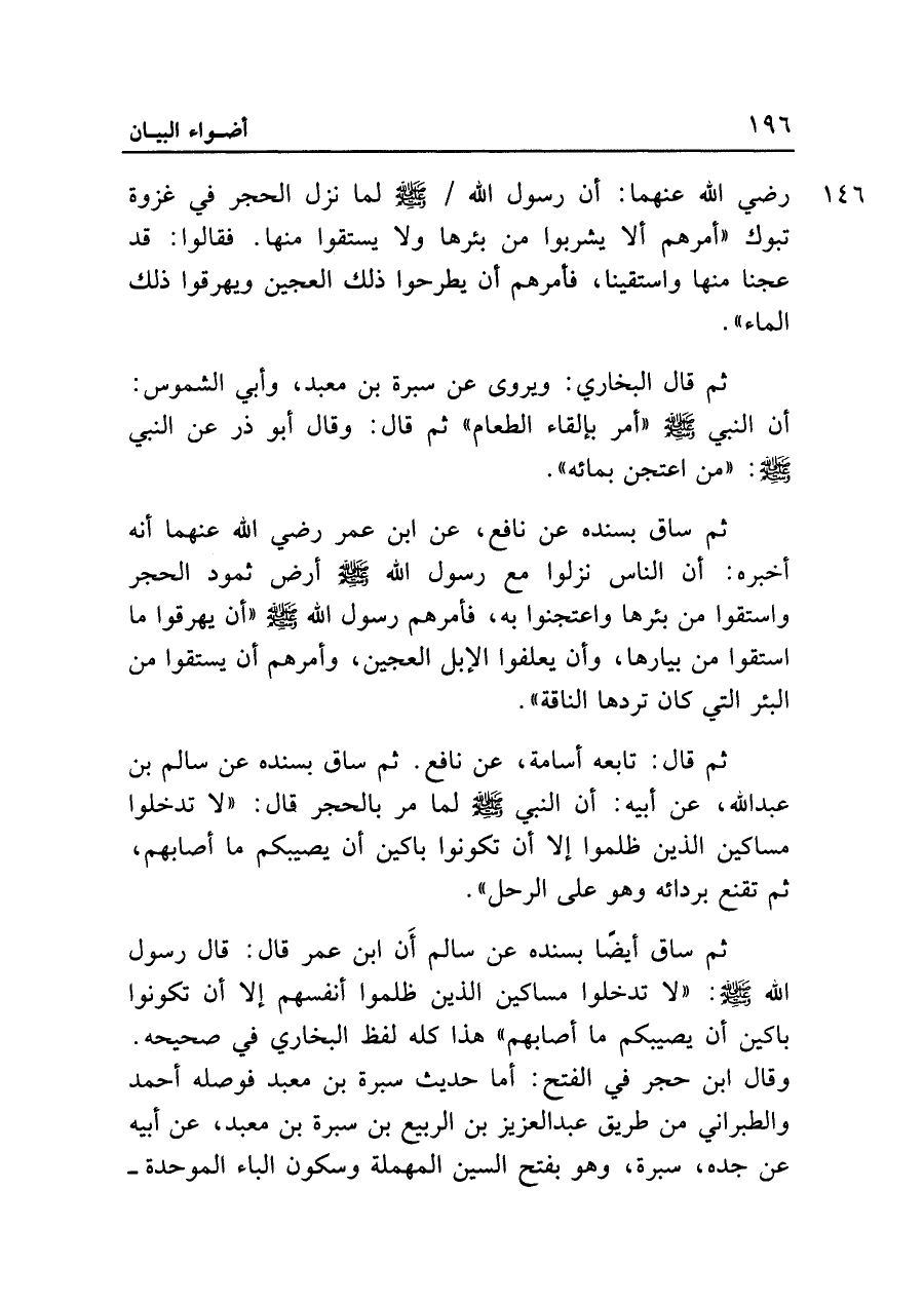 ثم ساق أيضًا بسنده عن سالم أَن ابن عمر قال: قال رسول الله - صلى الله عليه وسلم -: "لا تدخلوا مساكين الذين ظلموا أنفسهم إلا أن تكونوا باكين أن يصيبكم ما أصابهم" هذا كله لفظ البخاري في صحيحه. وقال ابن حجر في الفتح: أما حديث سبرة بن معبد فوصله أحمد والطبراني من طريق عبد العزيز بن الربيع بن سبرة بن معبد، عن أبيه عن جده، سبرة، وهو بفتح السين المهملة وسكون الباء الموحدة=