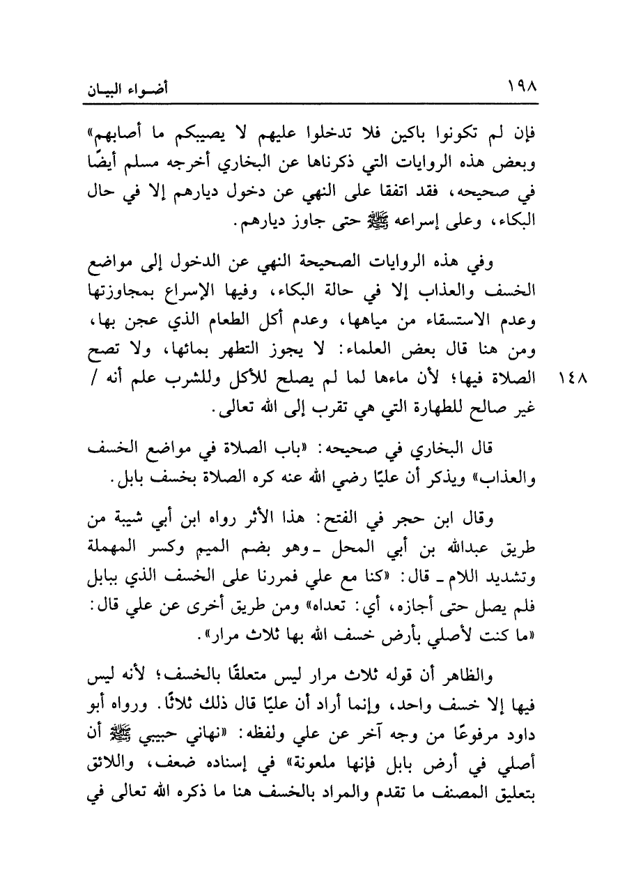 وقال ابن حجر في الفتح: هذا الأثر رواه ابن أبي شيبة من طريق عبد الله بن أبي المحل -وهو بضم الميم وكسر المهملة وتشديد اللام- قال: "كنا مع علي فمررنا على الخسف الذي ببابل فلم يصل حتى أجازه، أي: تعداه" ومن طريق أخرى عن علي قال: "ما كنت لأصلي بأرض خسف الله بها ثلاث مرار".