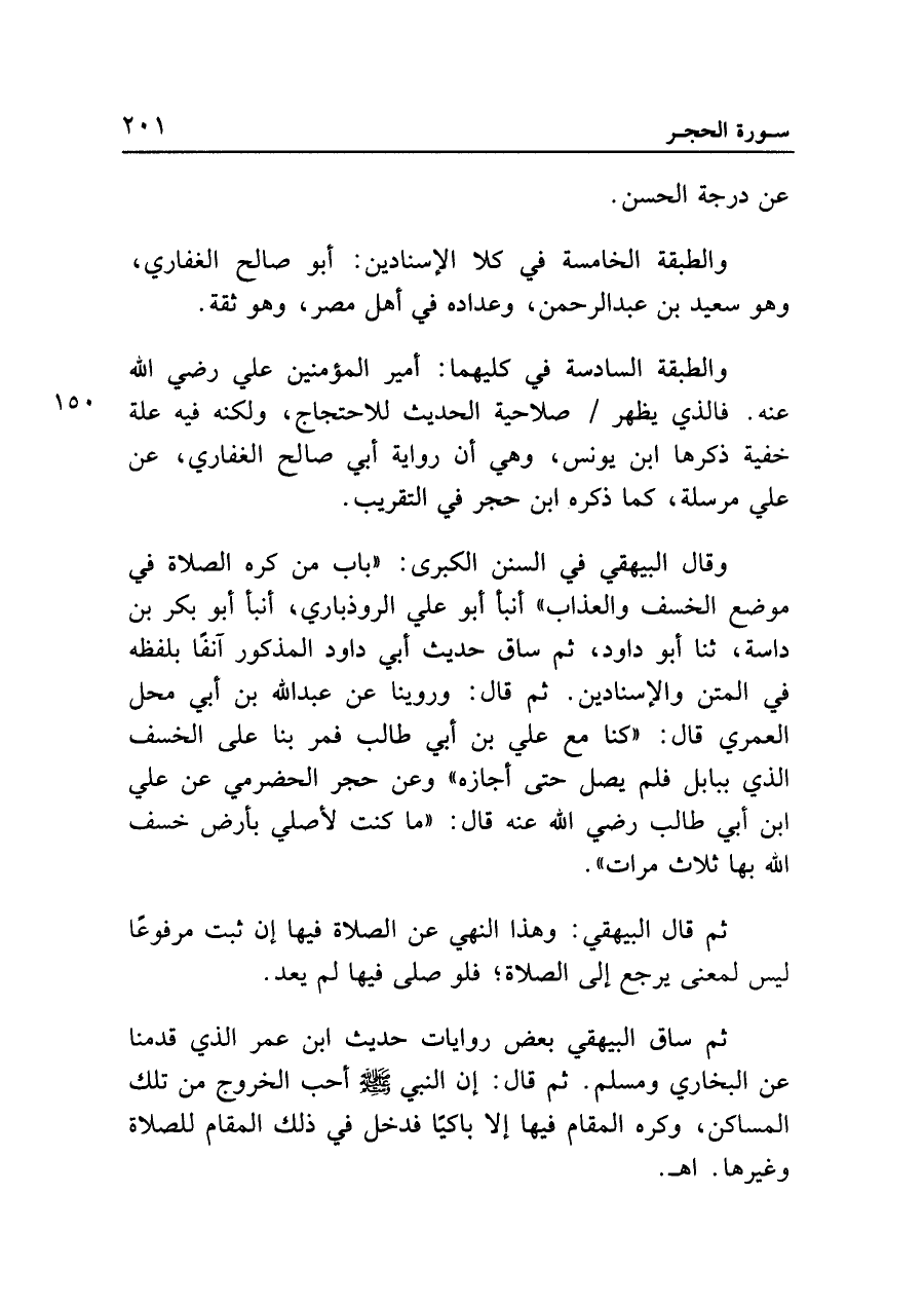 وقال البيهقي في السنن الكبرى: "باب من كره الصلاة في موضع الخسف والعذاب" أنبأ أبو علي الروذباري، أنبأ أبو بكر بن داسة، ثنا أبو داود، ثم ساق حديث أبي داود المذكور آنفًا بلفظه في المتن والإسنادين. ثم قال: وروينا عن عبد الله بن أبي محل العمري قال: "كنا مع علي بن أبي طالب فمر بنا على الخسف الذي ببابل فلم يصل حتى أجازه" وعن حجر الحضرمي عن علي ابن أبي طالب رضي الله عنه قال: "ما كنت لأصلي بأرض خسف الله بها ثلاث مرات".