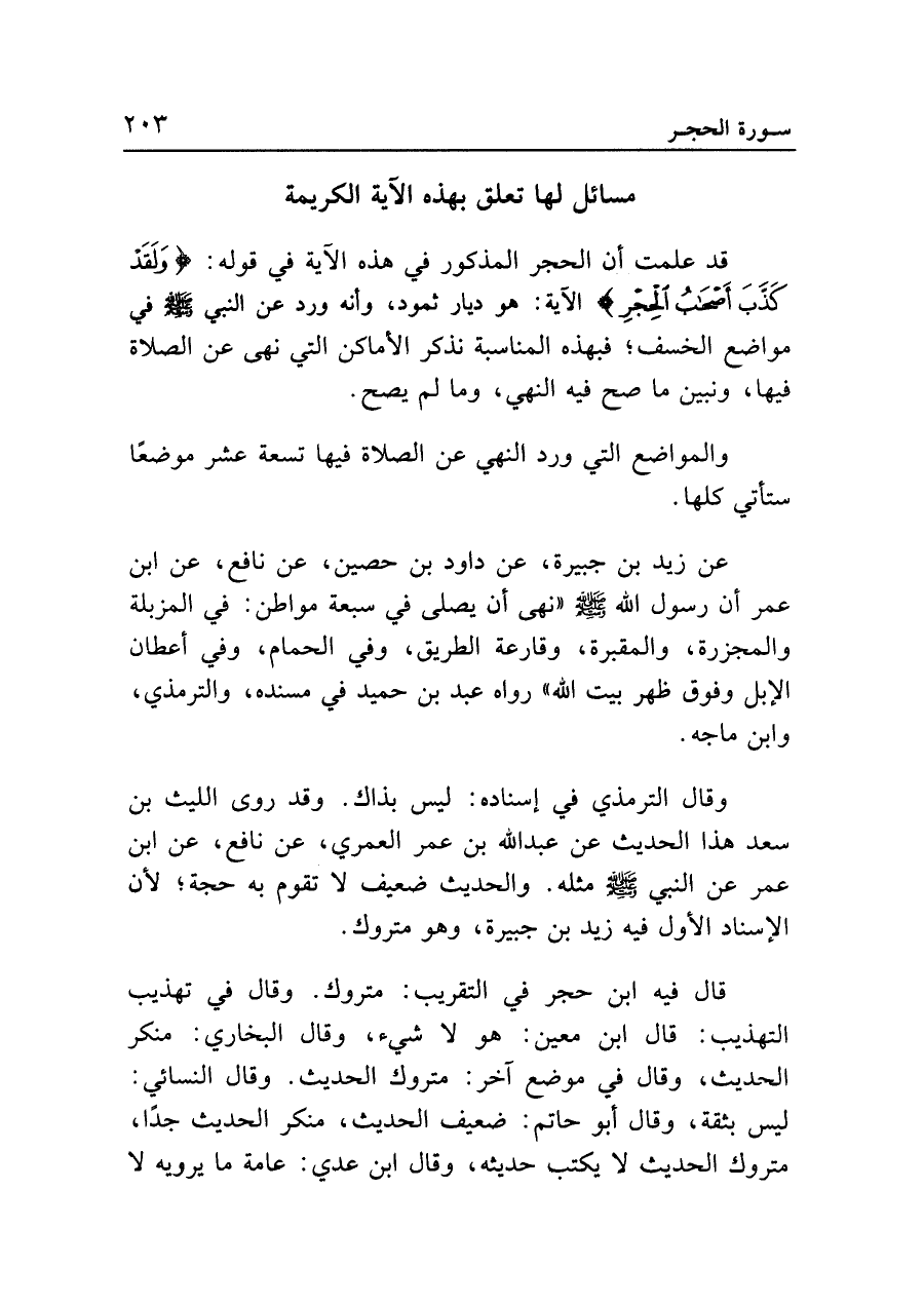 قد علمت أن الحجر المذكور في هذه الآية في قوله: {وَلَقَدْ كَذَّبَ أَصْحَابُ الْحِجْرِ} الآية: هو ديار ثمود، وأنه ورد النبي - صلى الله عليه وسلم - في مواضع الخسف؛ فبهذه المناسبة نذكر الأماكن التي نهى عن الصلاة فيها، ونبين ما صح فيه النهي، وما لم يصح.