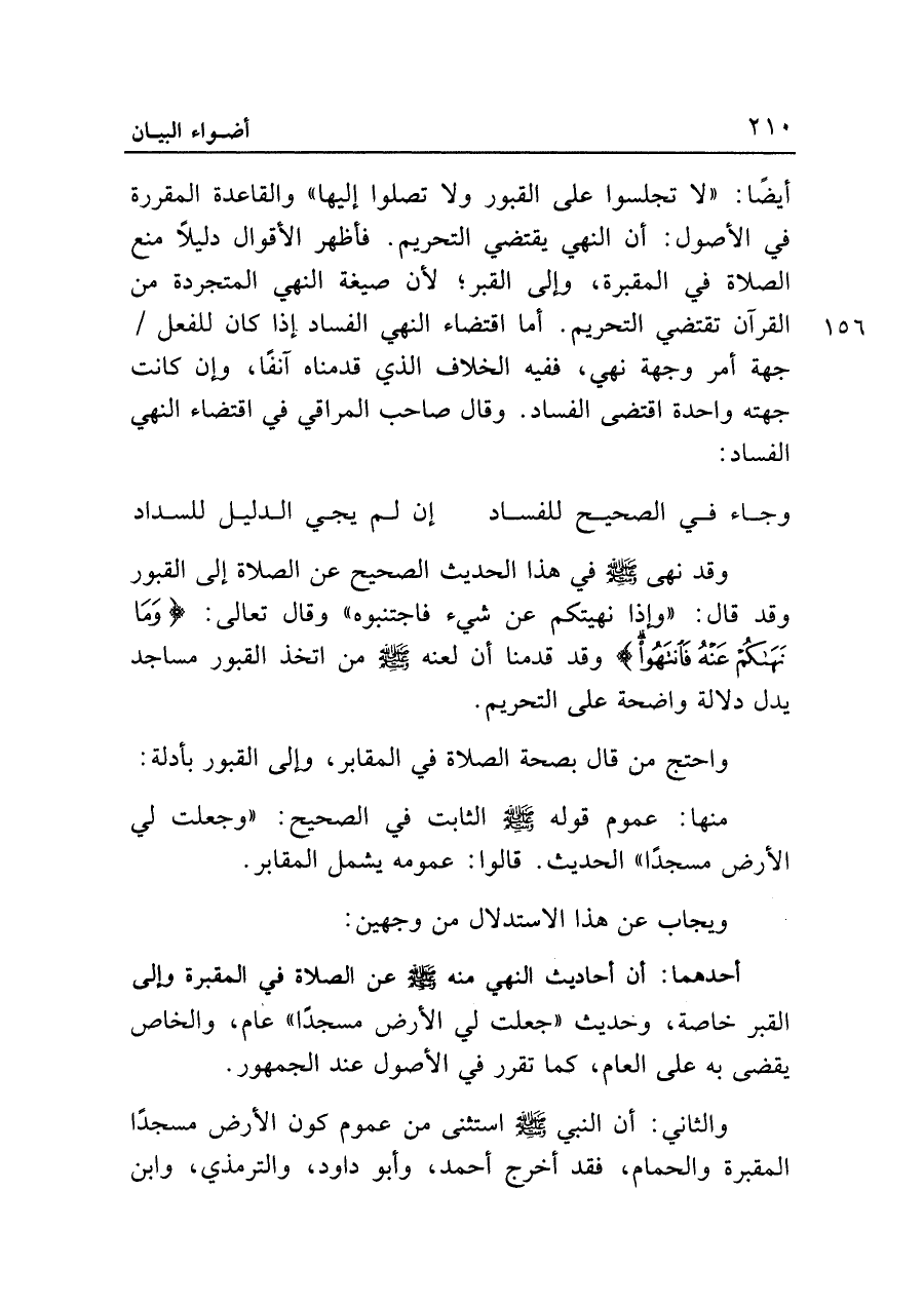 أيضًا: "لا تجلسوا على القبور ولا تصلوا إليها" والقاعدة المقررة في الأصول: أن النهي يقتضي التحريم. فأظهر الأقوال دليلًا منع الصلاة في المقبرة، وإلى القبر، لأن صيغة النهي المتجردة من القرآن تقتضي التحريم. أما اقتضاء النهي الفساد إذا كان للفعل جهة أمر وجهة نهي، ففيه الخلاف الذي قدمناه آنفًا، وإن كانت جهته واحدة اقتضى الفساد. وقال صاحب المراقي في اقتضاء النهي الفساد: