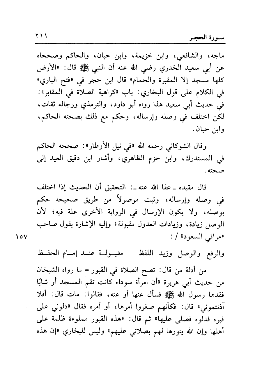 من أدلة من قال: تصح الصلاة في القبور= ما رواه الشيخان من حديث أبي هريرة "أن امرأة سوداء كانت تقم المسجد أو شابًا فقدها رسول الله - صلى الله عليه وسلم - فسأل عنها أو عنه، فقالوا: مات قال: أفلا آذنتموني" قال: فكأنهم صغروا أمرها، أو أمره فقال "دلوني على قبره فدلوه فصلى عليها" ثم قال: "هذه القبور مملوءة ظلمة على أهلها وإن الله ينورها لهم بصلاتي عليهم" وليس للبخاري "إن هذه