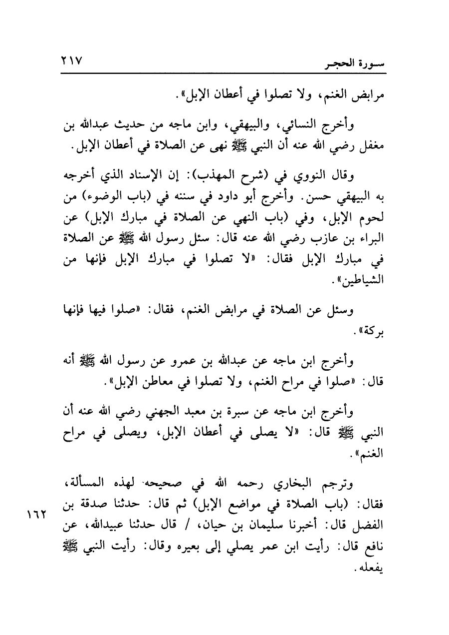 وقال النووي في (شرح المهذب): إن الإسناد الذي أخرجه به البيهقي حسن. وأخرج أبو داود في سننه في (باب الوضوء) من لحوم الإبل، وفي (باب النهي عن الصلاة في مبارك الإبل) عن البراء بن عازب رضي الله عنه قال: سئل رسول الله - صلى الله عليه وسلم - عن الصلاة في مبارك الإبل فقال: "لا تصلوا في مبارك الإبل فإنها من الشياطين".