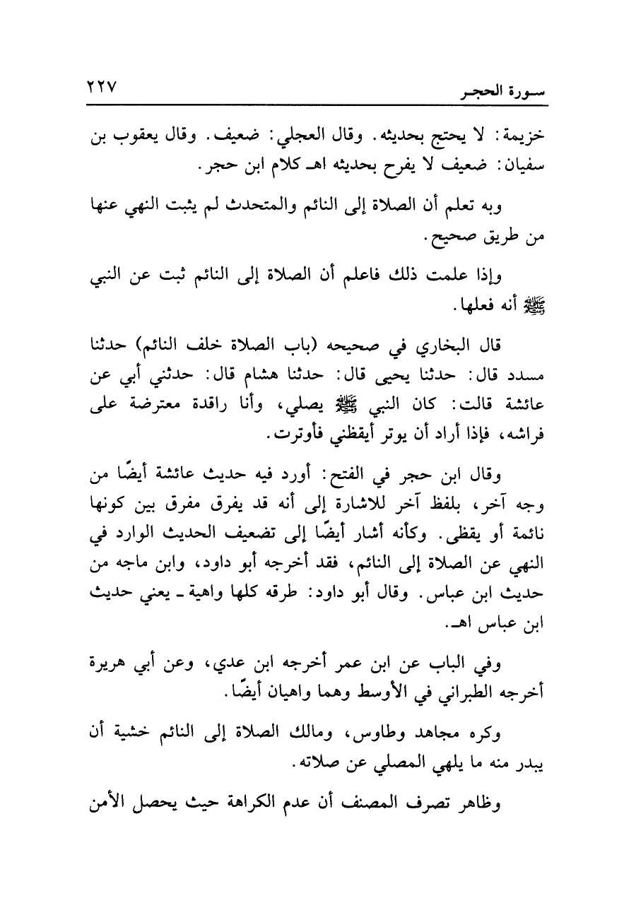 وقال ابن حجر في الفتح: أورد فيه حديث عائشة أيضًا من وجه آخر، بلفظ آخر للإشارة إلى أنه قد يفرق مفرق بين كونها نائمة أو يقظى. وكأنه أشار أيضًا إلى تضعيف الحديث الوارد في النهي عن الصلاة إلى النائم، فقد أخرجه أبو داود، وابن ماجه من حديث ابن عباس. وقال أبو داود: طرقه كلها واهية -يعني حديث ابن عباس اه.