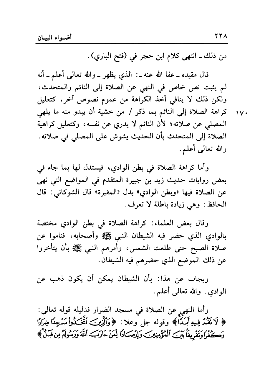 وأما النهي عن الصلاة في مسجد الضرار فدليله قوله تعالى: {لَا تَقُمْ فِيهِ أَبَدًا} وقوله جل وعلا: {وَالَّذِينَ اتَّخَذُوا مَسْجِدًا ضِرَارًا وَكُفْرًا وَتَفْرِيقًا بَيْنَ الْمُؤْمِنِينَ وَإِرْصَادًا لِمَنْ حَارَبَ اللَّهَ وَرَسُولَهُ مِنْ قَبْلُ}
