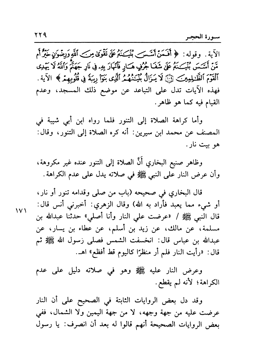 الآية. وقوله: {أَفَمَنْ أَسَّسَ بُنْيَانَهُ عَلَى تَقْوَى مِنَ اللَّهِ وَرِضْوَانٍ خَيْرٌ أَمْ مَنْ أَسَّسَ بُنْيَانَهُ عَلَى شَفَا جُرُفٍ هَارٍ فَانْهَارَ بِهِ فِي نَارِ جَهَنَّمَ وَاللَّهُ لَا يَهْدِي الْقَوْمَ الظَّالِمِينَ (١٠٩) لَا يَزَالُ بُنْيَانُهُمُ الَّذِي بَنَوْا رِيبَةً فِي قُلُوبِهِمْ} الآية. فهذه الآيات تدل على التباعد عن موضع ذلك المسجد، وعدم القيام فيه كما هو ظاهر.