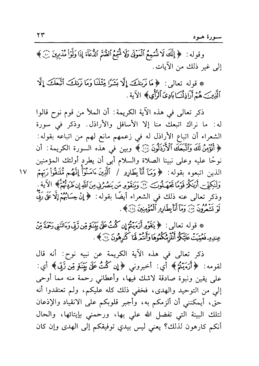 ذكر تعالى في هذه الآية الكريمة: أن الملأ من قوم نوح قالوا له: ما نراك اتبعك منا إلَّا الأسافل والأراذل. وذكر في سورة الشعراء أن اتباع الأراذل له في زعمهم مانع لهم من اتباعه بقوله: {قَالُوا أَنُؤْمِنُ لَكَ وَاتَّبَعَكَ الْأَرْذَلُونَ (١١١)} وبين في هذه السورة الكريمة: أن نوحًا عليه وعلى نبينا الصلاة والسلام أَبى أن يطرد أولئك المؤمنين الذين اتبعوه بقوله: {وَمَا أَنَا بِطَارِدِ الَّذِينَ آمَنُوا إِنَّهُمْ مُلَاقُو رَبِّهِمْ وَلَكِنِّي أَرَاكُمْ قَوْمًا تَجْهَلُونَ (٢٩) وَيَاقَوْمِ مَنْ يَنْصُرُنِي مِنَ اللَّهِ إِنْ طَرَدْتُهُمْ} الآية وذكر تعالى عنه ذلك في الشعراء أيضًا بقوله: {إِنْ حِسَابُهُمْ إِلَّا عَلَى رَبِّي لَوْ تَشْعُرُونَ (١١٣) وَمَا أَنَا بِطَارِدِ الْمُؤْمِنِينَ (١١٤)}.