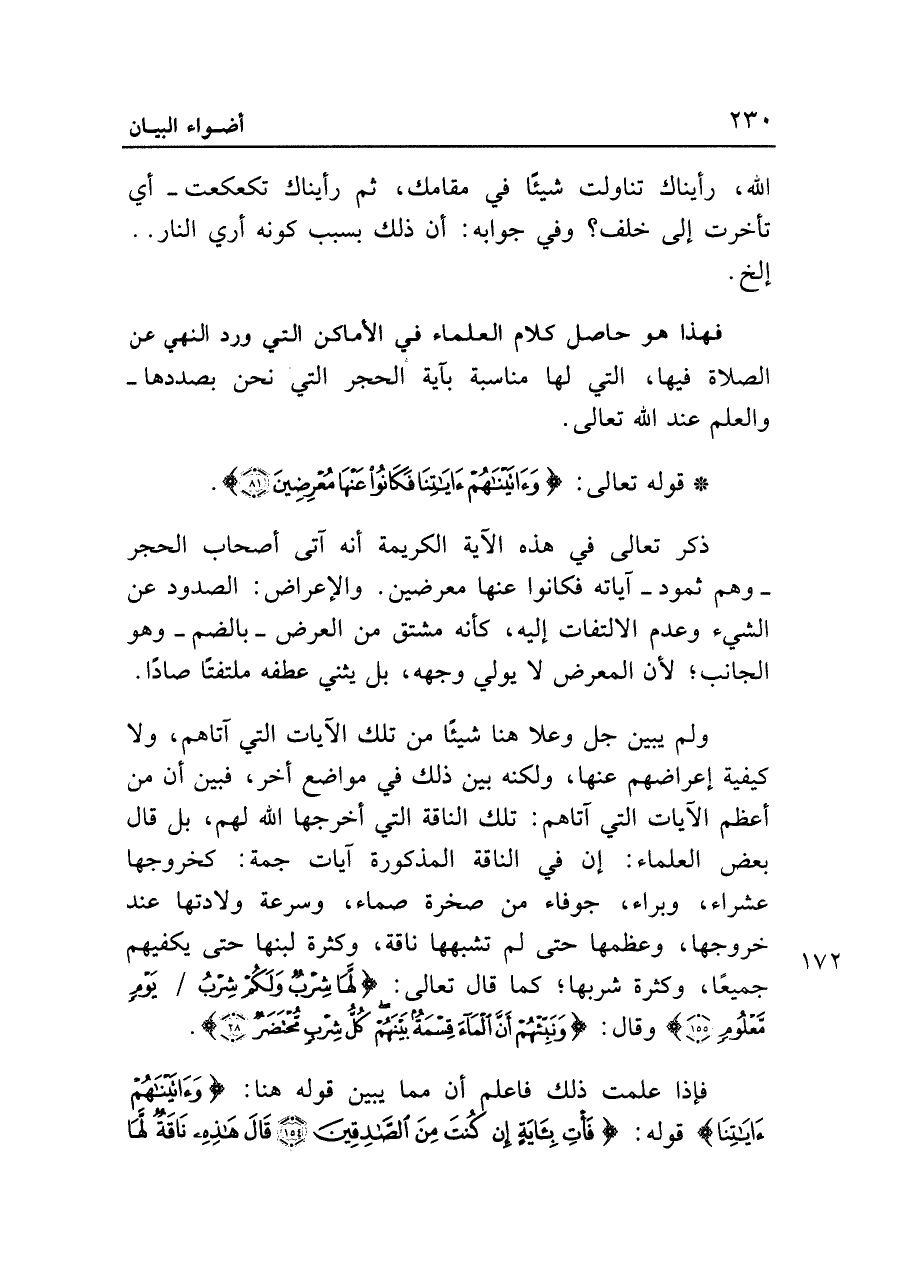 ذكر تعالى في هذه الآية الكريمة أنه آتى أصحاب الحجر -وهم ثمود- آياته فكانوا عنها معرضين. والإعراض: الصدود عن الشيء وعدم الالتفات إليه، كأنه مشتق من العرض -بالضم- وهو الجانب؛ لأن المعرض لا يولي وجهه، بل يثني عطفه ملتفتًا صادًا.