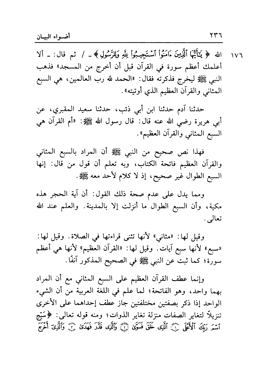 فهذا نص صحيح من النبي - صلى الله عليه وسلم - أن المراد بالسبع المثاني والقرآن العظيم فاتحة الكتاب، وبه تعلم أن قول من قال: إنها السبع الطوال غير صحيح، إذ لا كلام لأحد معه - صلى الله عليه وسلم -.