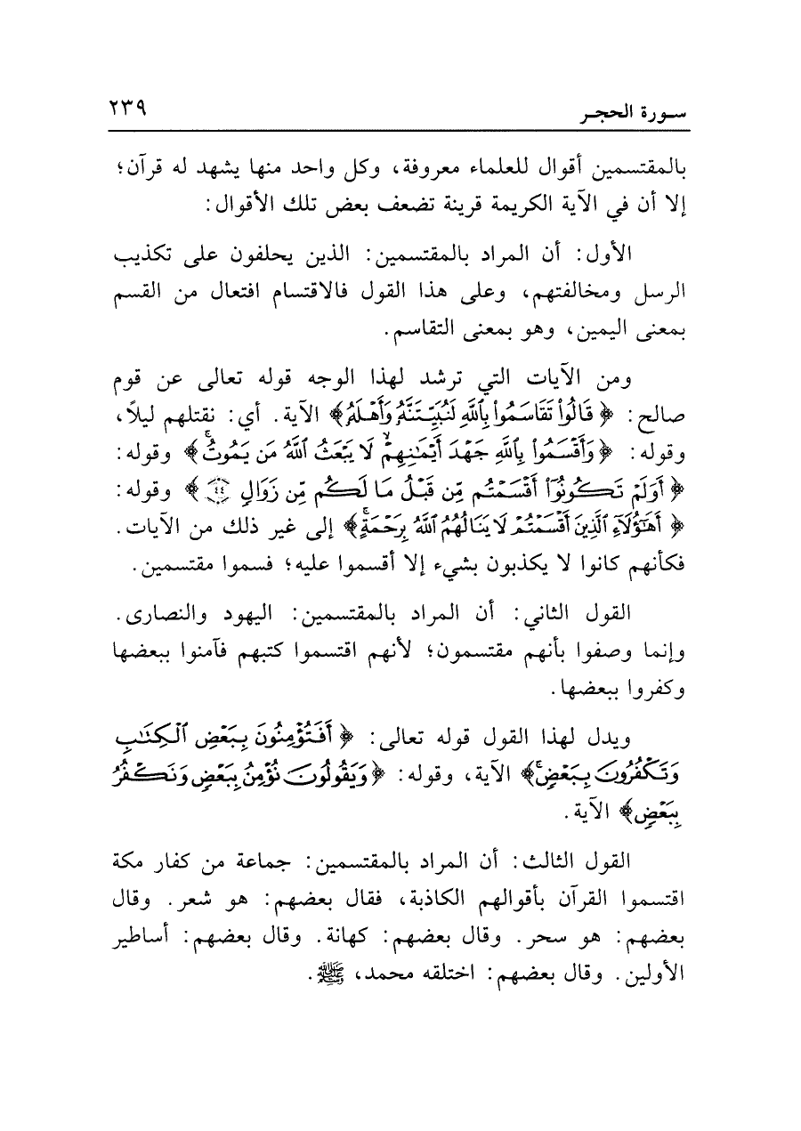 ومن الآيات التي ترشد لهذا الوجه قوله تعالى عن قوم صالح: {قَالُوا تَقَاسَمُوا بِاللَّهِ لَنُبَيِّتَنَّهُ وَأَهْلَهُ} الآية. أي: نقتلهم ليلًا، وقوله: {وَأَقْسَمُوا بِاللَّهِ جَهْدَ أَيْمَانِهِمْ لَا يَبْعَثُ اللَّهُ مَنْ يَمُوتُ} وقوله: {أَوَلَمْ تَكُونُوا أَقْسَمْتُمْ مِنْ قَبْلُ مَا لَكُمْ مِنْ زَوَالٍ (٤٤)} وقوله: {أَهَؤُلَاءِ الَّذِينَ أَقْسَمْتُمْ لَا يَنَالُهُمُ اللَّهُ بِرَحْمَةٍ} إلى غير ذلك من الآيات. فكأنهم كانوا لا يكذبون بشيء إلا أقسموا عليه؛ فسموا مقتسمين.