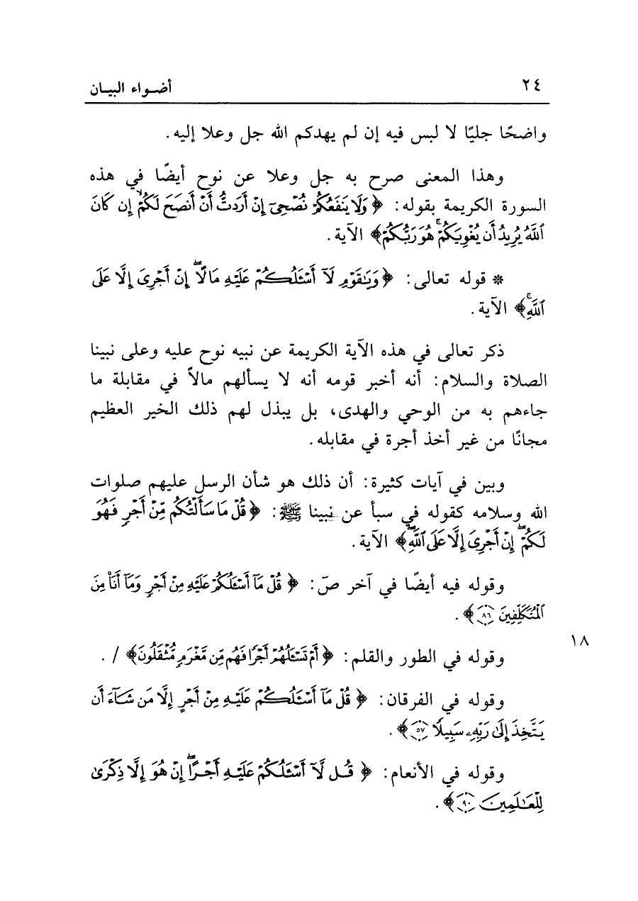 وبين في آيات كثيرة: أن ذلك هو شأن الرسل عليهم صلوات الله وسلامه كقوله فى سبأ عن نبينا - صلى الله عليه وسلم -: {قُلْ مَا سَأَلْتُكُمْ مِنْ أَجْرٍ فَهُوَ لَكُمْ إِنْ أَجْرِيَ إِلَّا عَلَى اللَّهِ} والآية.