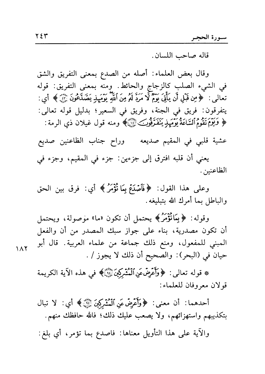 • قوله تعالى: {وَأَعْرِضْ عَنِ الْمُشْرِكِينَ (٩٤)} في هذه الآية الكريمة قولان معروفان للعلماء: