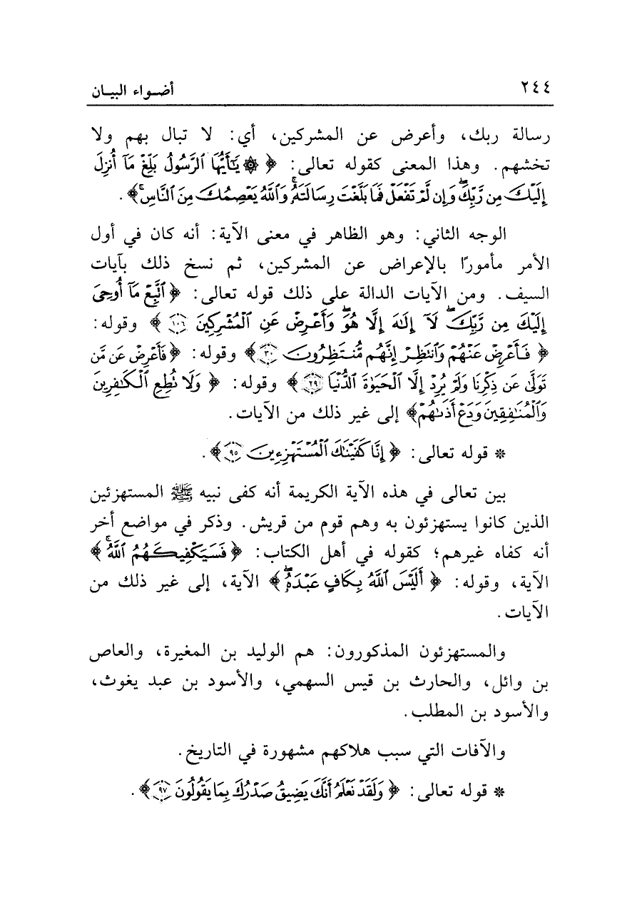 بين تعالى في هذه الآية الكريمة أنه كفى نبيه - صلى الله عليه وسلم - المستهزئين الذين كانوا يستهزئون به وهم قوم من قريش. وذكر في مواضع أخر أنه كفاه غيرهم؛ كقوله في أهل الكتاب: {فَسَيَكْفِيكَهُمُ اللَّهُ} الآية، وقوله: {أَلَيْسَ اللَّهُ بِكَافٍ عَبْدَهُ} الآية، إلى غير ذلك من الآيات.