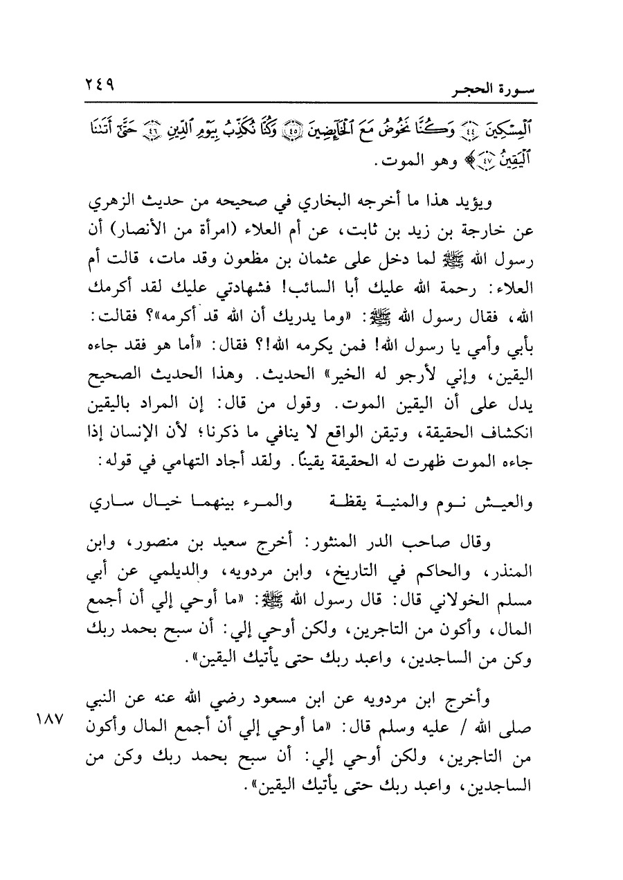 ويؤيد هذا ما أخرجه البخاري في صحيحه من حديث الزهري عن خارجة بن زيد بن ثابت، عن أم العلاء (امرأة من الأنصار) أن رسول الله - صلى الله عليه وسلم - لما دخل على عثمان بن مظعون وقد مات، قالت أم العلاء: رحمة الله عليك أبا السائب! فشهادتي عليك لقد أكرمك الله، فقال رسول الله - صلى الله عليه وسلم -: "وما يدريك أن الله قد أكرمه"؟ فقالت: بأبي وأمي يا رسول الله! فمن يكرمه الله! ؟ فقال: "أما هو فقد جاءه اليقين، وإني لأرجو له الخير" الحديث. وهذا الحديث الصحيح يدل على أن اليقين الموت. وقول من قال: إن المراد باليقين انكشاف الحقيقة، وتيقن الواقع لا ينافي ما ذكرنا؛ لأن الإنسان إذا جاءه الموت ظهرت له الحقيقة يقينًا. ولقد أجاد التهامي في قوله:
