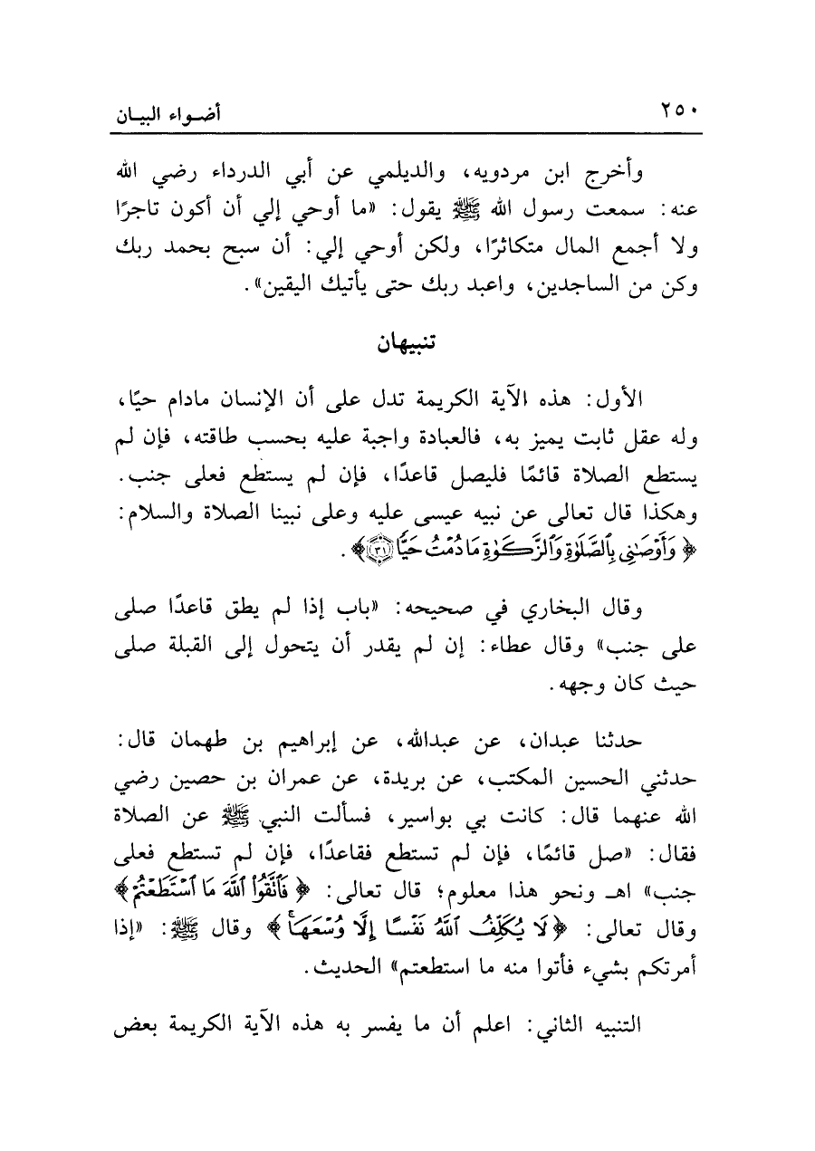 الأول: هذه الآية الكريمة تدل على أن الإنسان ما دام حيًا، وله عقل ثابت يميز به، فالعبادة واجبة عليه بحسب طاقته، فإن لم يستطع الصلاة قائمًا فليصل قاعدًا، فإن لم يستطع فعلى جنب. وهكذا قال تعالى عن نبيه عيسى عليه وعلى نبينا الصلاة والسلام: {وَأَوْصَانِي بِالصَّلَاةِ وَالزَّكَاةِ مَا دُمْتُ حَيًّا (٣١)}.