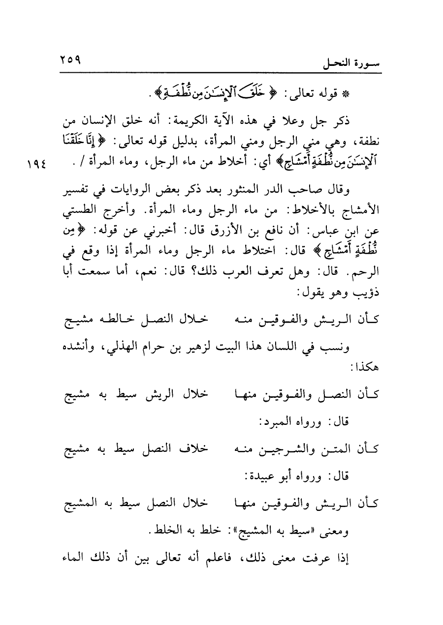 وقال صاحب الدر المنثور بعد ذكر بعض الروايات في تفسير الأمشاج بالأخلاط: من ماء الرجل وماء المرأة. وأخرج الطستي عن ابن عباس: أن نافع بن الأزرق قال: أخبرني عن قوله: {مِنْ نُطْفَةٍ أَمْشَاجٍ} قال: اختلاط ماء الرجل وماء المرأة إذا وقع في الرحم. قال: وهل تعرف العرب ذلك؟ قال: نعم، أما سمعت أبا ذؤيب وهو يقول: