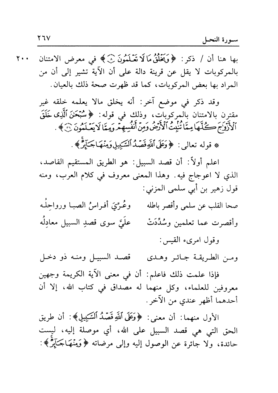 اعلم أولًا: أن قصد السبيل: هو الطريق المستقيم القاصد، الذي لا اعوجاج فيه. وهذا المعنى معروف في كلام العرب، ومنه قول زهير بن أبي سلمى المزني: