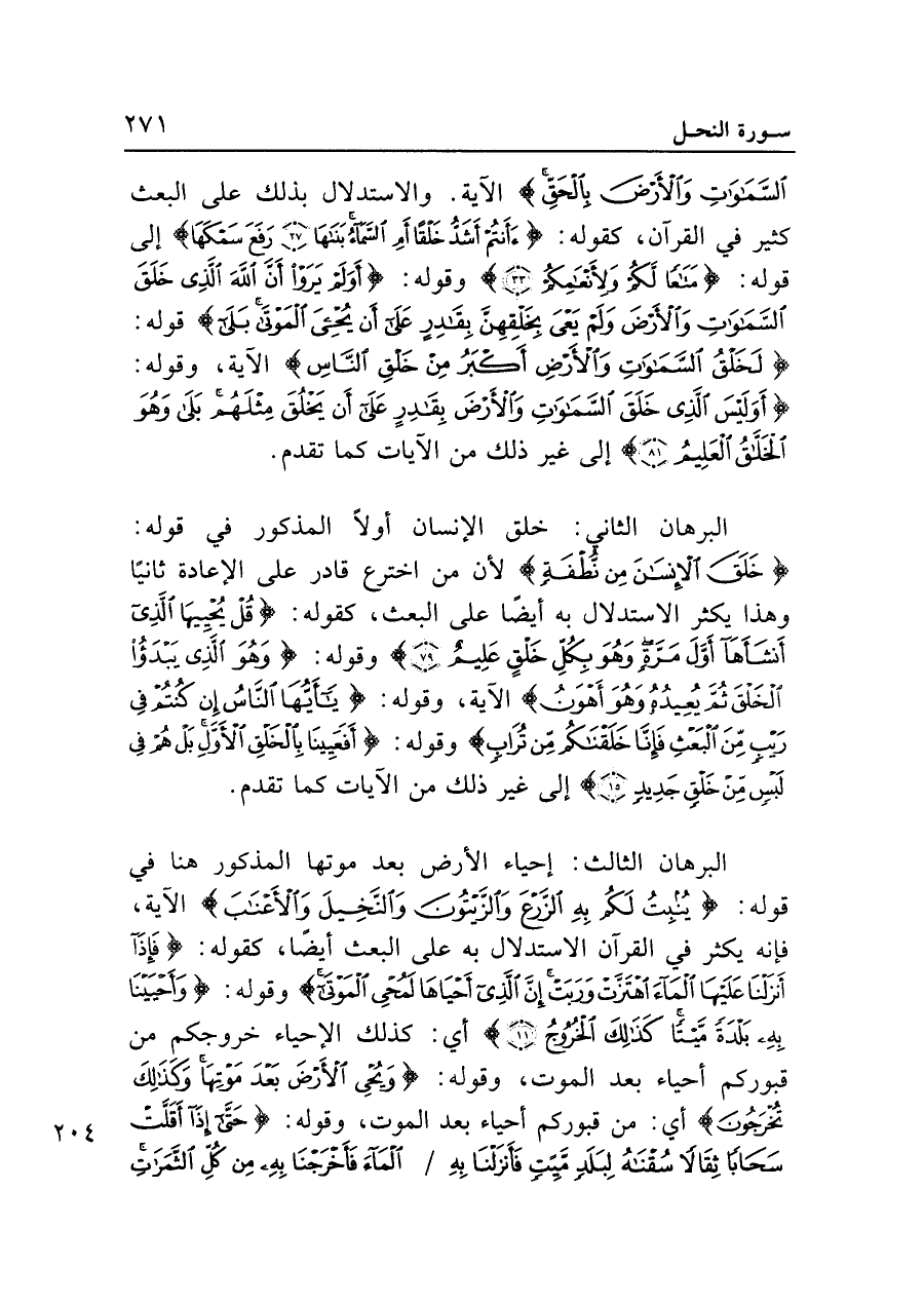 السَّمَاوَاتِ وَالْأَرْضَ بِالْحَقِّ} الآية. والاستدلال بذلك على البعث كثير في القرآن، كقوله: {أَأَنْتُمْ أَشَدُّ خَلْقًا أَمِ السَّمَاءُ بَنَاهَا (٢٧) رَفَعَ سَمْكَهَا} إلى قوله: {مَتَاعًا لَكُمْ وَلِأَنْعَامِكُمْ (٣٣)} وقوله: {أَوَلَمْ يَرَوْا أَنَّ اللَّهَ الَّذِي خَلَقَ السَّمَاوَاتِ وَالْأَرْضَ وَلَمْ يَعْيَ بِخَلْقِهِنَّ بِقَادِرٍ عَلَى أَنْ يُحْيِيَ الْمَوْتَى بَلَى} قوله: {لَخَلْقُ السَّمَاوَاتِ وَالْأَرْضِ أَكْبَرُ مِنْ خَلْقِ النَّاسِ} الآية، وقوله: {أَوَلَيْسَ الَّذِي خَلَقَ السَّمَاوَاتِ وَالْأَرْضَ بِقَادِرٍ عَلَى أَنْ يَخْلُقَ مِثْلَهُمْ بَلَى وَهُوَ الْخَلَّاقُ الْعَلِيمُ (٨١)} إلى غير ذلك من الآيات كما تقدم.