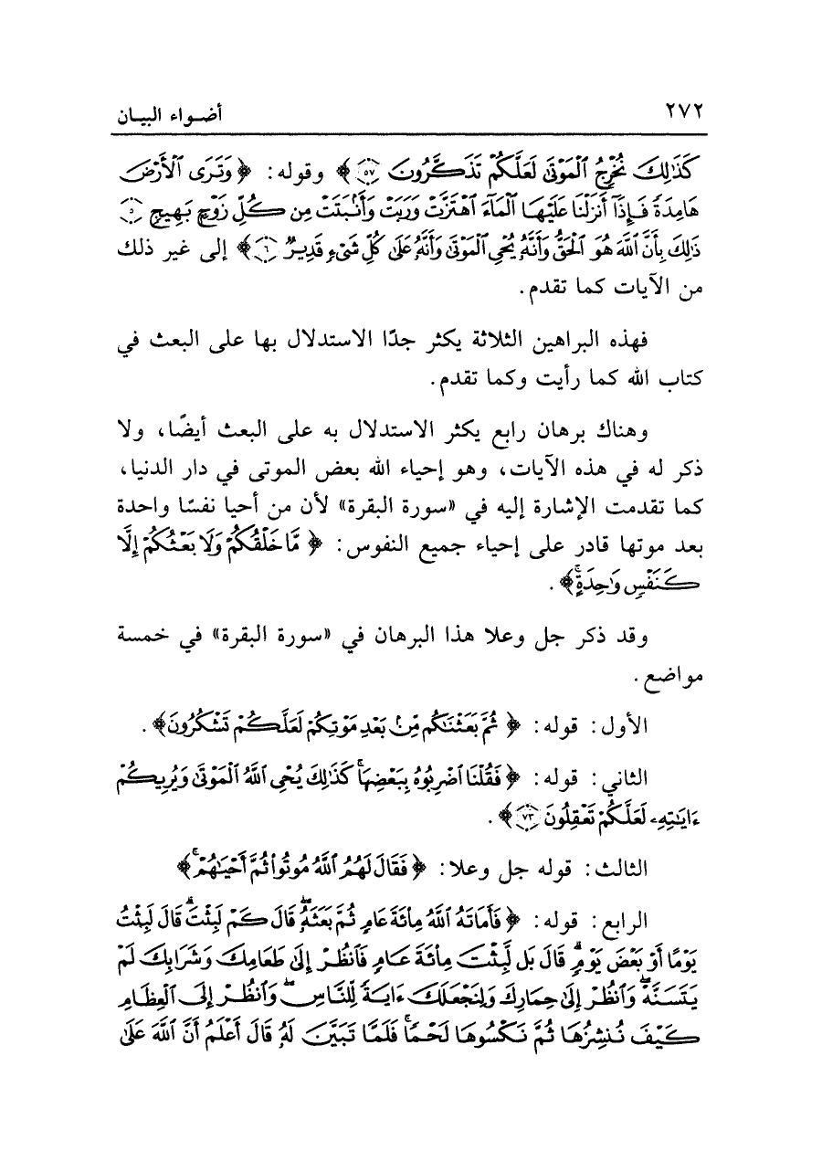 فهذه البراهين الثلاثة يكثر جدًا الاستدلال بها على البعث في كتاب الله كما رأيت وكما تقدم.