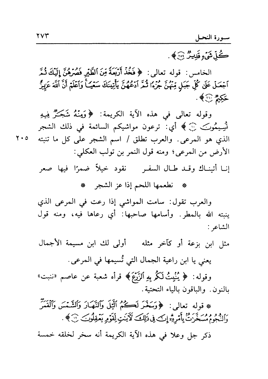 وقوله تعالى في هذه الآية الكريمة: {وَمِنْهُ شَجَرٌ فِيهِ تُسِيمُونَ (١٠)} أي: ترعون مواشيكم السائمة في ذلك الشجر الذي هو المرعى. والعرب تطلق اسم الشجر على كل ما تنبته الأرض من المرعى؛ ومنه قول النمر بن تولب العكلي: