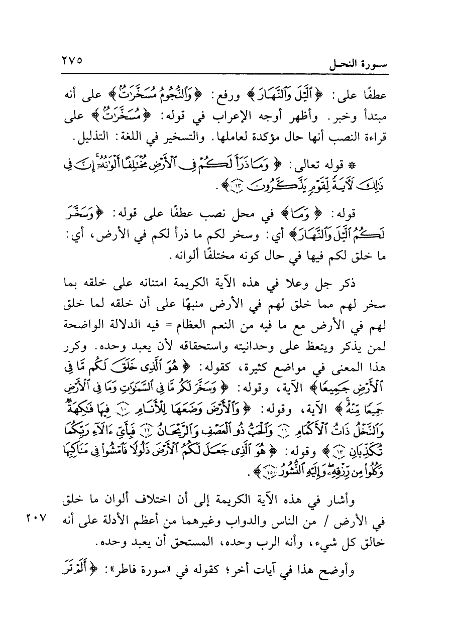 قوله: {وَمَا} في محل نصب عطفًا على قوله: {وَسَخَّرَ لَكُمُ اللَّيْلَ وَالنَّهَارَ} أي: وسخر لكم ما ذرأ لكم في الأرض، أي: ما خلق لكم فيها في حال كونه مختلفًا ألوانه.