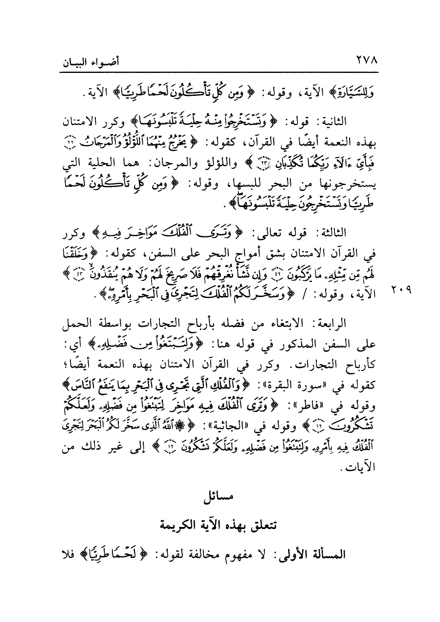 الثالثة: قوله تعالى: {وَتَرَى الْفُلْكَ مَوَاخِرَ فِيهِ} وكرر في القرآن الامتنان بشق أمواج البحر على السفن، كقوله: {وَخَلَقْنَا لَهُمْ مِنْ مِثْلِهِ مَا يَرْكَبُونَ (٤٢) وَإِنْ نَشَأْ نُغْرِقْهُمْ فَلَا صَرِيخَ لَهُمْ وَلَا هُمْ يُنْقَذُونَ (٤٣)} الآية، وقوله: {وَسَخَّرَ لَكُمُ الْفُلْكَ لِتَجْرِيَ فِي الْبَحْرِ بِأَمْرِهِ}.