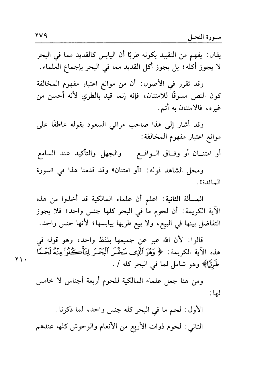 المسألة الثانية: اعلم أن علماء المالكية قد أخذوا من هذه الآية الكريمة: أن لحوم ما في البحر كلها جنس واحد؛ فلا يجوز التفاضل بينها في البيع، ولا بيع طريها بيابسها، لأنها جنس واحد.