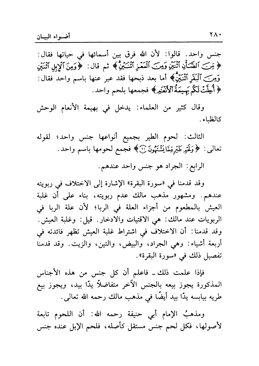 جنس واحد. قالوا: لأن الله فرق بين أسمائها في حياتها فقال: {مِنَ الضَّأْنِ اثْنَيْنِ وَمِنَ الْمَعْزِ اثْنَيْنِ} ثم قال: {وَمِنَ الْإِبِلِ اثْنَيْنِ وَمِنَ الْبَقَرِ اثْنَيْنِ} أما بعد ذبحها فقد عبر عنها باسم واحد فقال: {أُحِلَّتْ لَكُمْ بَهِيمَةُ الْأَنْعَامِ} فجمعها بلحم واحد.