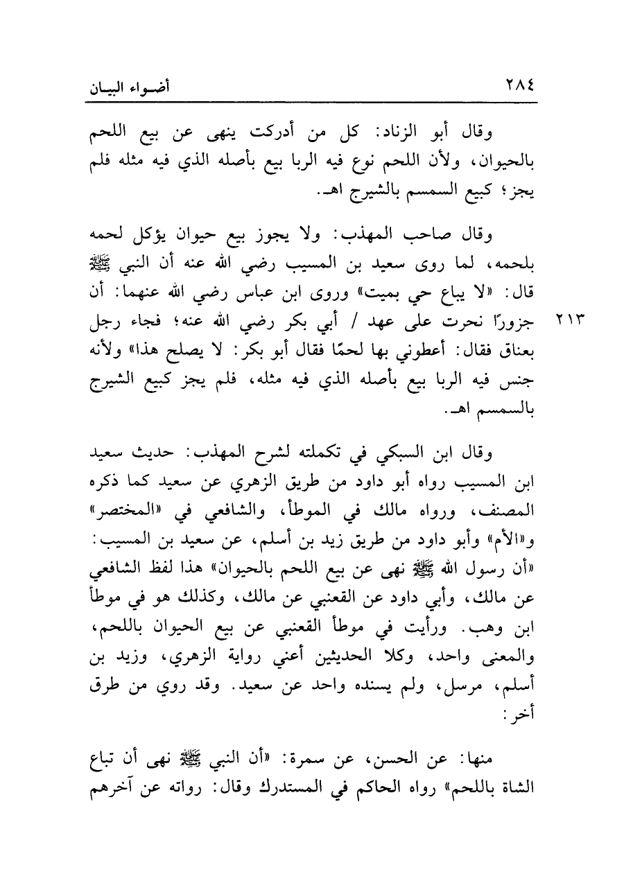 وقال ابن السبكي في تكملته لشرح المهذب: حديث سعيد ابن المسيب رواه أبو داود من طريق الزهري عن سعيد كما ذكره المصنف، ورواه مالك في الموطأ، والشافعي في "المختصر" و"الأم" وأبو داود من طريق زيد بن أسلم، عن سعيد بن المسيب: "أن رسول الله - صلى الله عليه وسلم - نهى عن بيع اللحم بالحيوان" هذا لفظ الشافعي عن مالك، وأبي داود عن القعنبي عن مالك، وكذلك هو في موطأ ابن وهب. ورأيت في موطأ القعنبي عن بيع الحيوان باللحم، والمعنى واحد، وكلا الحديثين أعني رواية الزهري، وزيد بن أسلم، مرسل، ولم يسنده واحد عن سعيد. وقد روي من طرق أخر: