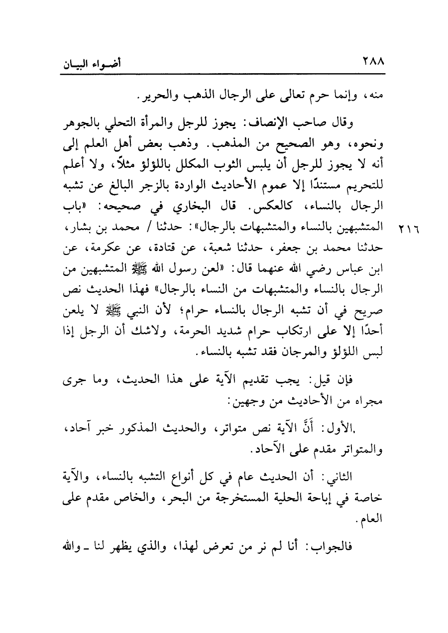 وقال صاحب الإنصاف: يجوز للرجل والمرأة التحلي بالجوهر ونحوه، وهو الصحيح من المذهب. وذهب بعض أهل العلم إلى أنه لا يجوز للرجل أن يلبس الثوب المكلل باللؤلؤ مثلًا، ولا أعلم للتحريم مستندًا إلا عموم الأحاديث الواردة بالزجر البالغ عن تشبه الرجال بالنساء، كالعكس. قال البخاري في صحيحه: "باب المتشبهين بالنساء والمتشبهات بالرجال": حدثنا محمد بن بشار، حدثنا محمد بن جعفر، حدثنا شعبة، عن قتادة، عن عكرمة، عن ابن عباس رضي الله عنهما قال: "لعن رسول الله - صلى الله عليه وسلم - المتشبهين من الرجال بالنساء والمتشبهات من النساء بالرجال" فهذا الحديث نص صريح في أن تشبه الرجال بالنساء حرام، لأن النبي - صلى الله عليه وسلم - لا يلعن أحدًا إلا على ارتكاب حرام شديد الحرمة، ولاشك أن الرجل إذا لبس اللؤلؤ والمرجان فقد تشبه بالنساء.
