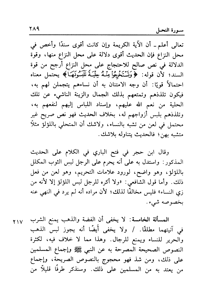 تعالى أعلم- أن الآية الكريمة وإن كانت أقوى سندًا وأخص في محل النزاع فإن الحديث أقوى دلالة على محل النزاع منها، وقوة الدلالة في نص صالح للاحتجاج على محل النزاع أرجح من قوة السند؛ لأن قوله: {وَتَسْتَخْرِجُوا مِنْهُ حِلْيَةً تَلْبَسُونَهَا} يحتمل معناه احتمالًا قويًا: أن وجه الامتنان به أن نساءهم يتجملن لهم به، فيكون تلذذهم وتمتعهم بذلك الجمال والزينة الناشيء عن تلك الحلية من نعم الله عليهم، وإسناد اللباس إليهم لنفعهم به، وتلذذهم بلبس أزواجهم له، بخلاف الحديث فهو نص صريح غير محتمل في لعن من تشبه بالنساء، ولاشك أن المتحلي باللؤلؤ مثلًا متشبه بهن؛ فالحديث يتناوله بلاشك.