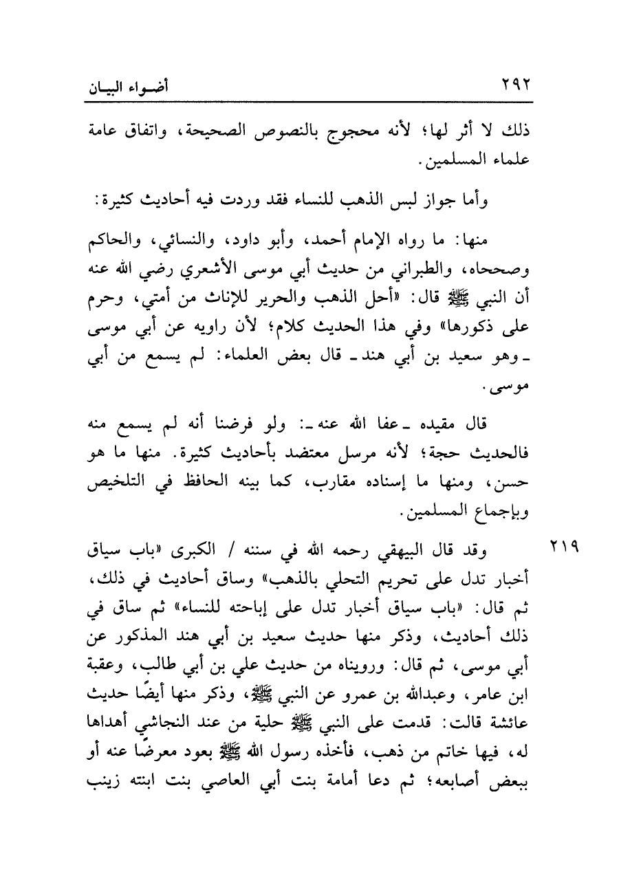 وقد قال البيهقي رحمه الله في سننه الكبرى "باب سياق أخبار تدل على تحريم التحلي بالذهب" وساق أحاديث في ذلك، ثم قال: "باب سياق أخبار تدل على إباحته للنساء" ثم ساق في ذلك أحاديث، وذكر منها حديث سعيد بن أبي هند المذكور عن أبي موسى، ثم قال: ورويناه من حديث علي بن أبي طالب، وعقبة ابن عامر، وعبد الله بن عمرو عن النبي - صلى الله عليه وسلم -، وذكر منها أيضًا حديث عائشة قالت: قدمت على النبي - صلى الله عليه وسلم - حلية من عند النجاشي أهداها له، فيها خاتم من ذهب، فأخذه رسول الله - صلى الله عليه وسلم - بعود معرضًا عنه أو ببعض أصابعه؛ ثم دعا أمامة بنت أبي العاصي بنت ابنته زينب