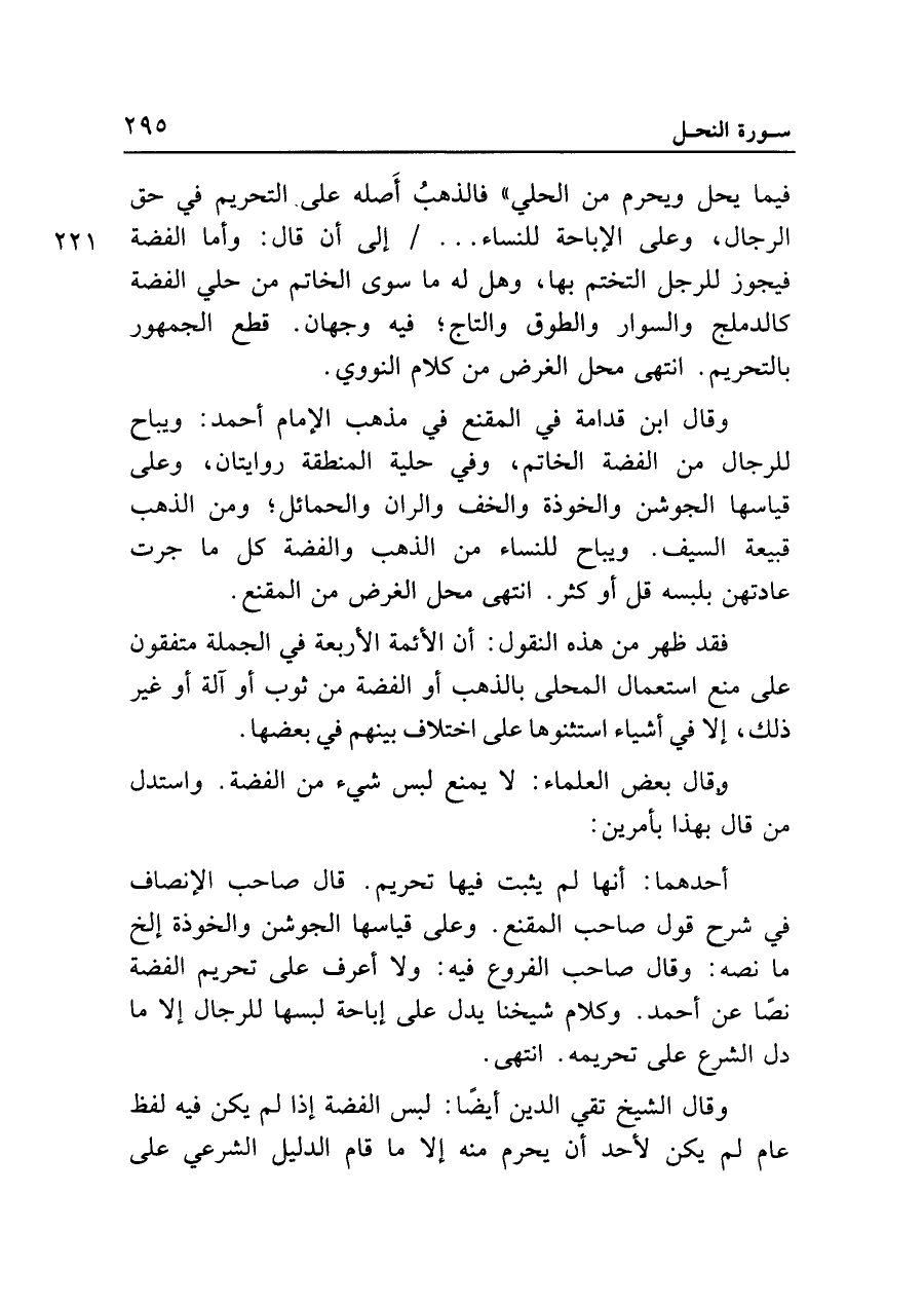 وقال الشيخ تقي الدين أيضًا: لبس الفضة إذا لم يكن فيه لفظ عام لم يكن لأحد أن يحرم منه إلا ما قام الدليل الشرعي على