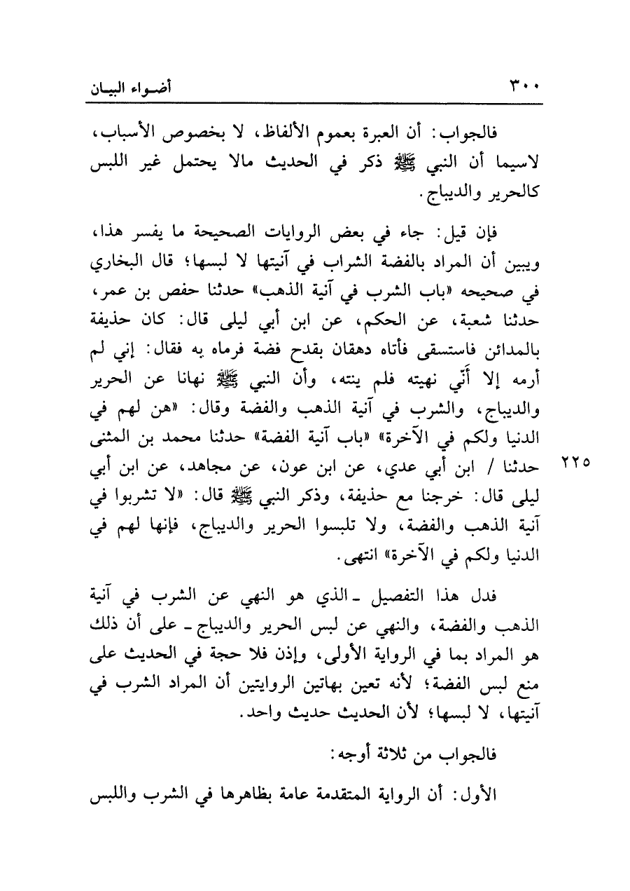 فإن قيل: جاء في بعض الروايات الصحيحة ما يفسر هذا، ويبين أن المراد بالفضة الشراب في آنيتها لا لبسها؛ قال البخاري في صحيحه "باب الشرب فى آنية الذهب" حدثنا حفص بن عمر، حدثنا شعبة، عن الحكم، عن ابن أبي ليلى قال: كان حذيفة بالمدائن فاستسقى فأتاه دهقان بقدح فضة فرماه به فقال: إني لم أرمه إلا أَنّي نهيته فلم ينته، وأن النبي - صلى الله عليه وسلم - نهانا عن الحرير والديباج، والشرب في آنية الذهب والفضة وقال: "هن لهم في الدنيا ولكم في الآخرة" "باب آنية الفضة" حدثنا محمد بن المثنى حدثنا ابن أبي عدي، عن ابن عون، عن مجاهد، عن ابن أبي ليلى قال: خرجنا مع حذيفة، وذكر النبي - صلى الله عليه وسلم - قال: "لا تشربوا في آنية الذهب والفضة، ولا تلبسوا الحرير والديباج، فإنها لهم في الدنيا ولكم في الآخرة" انتهى.