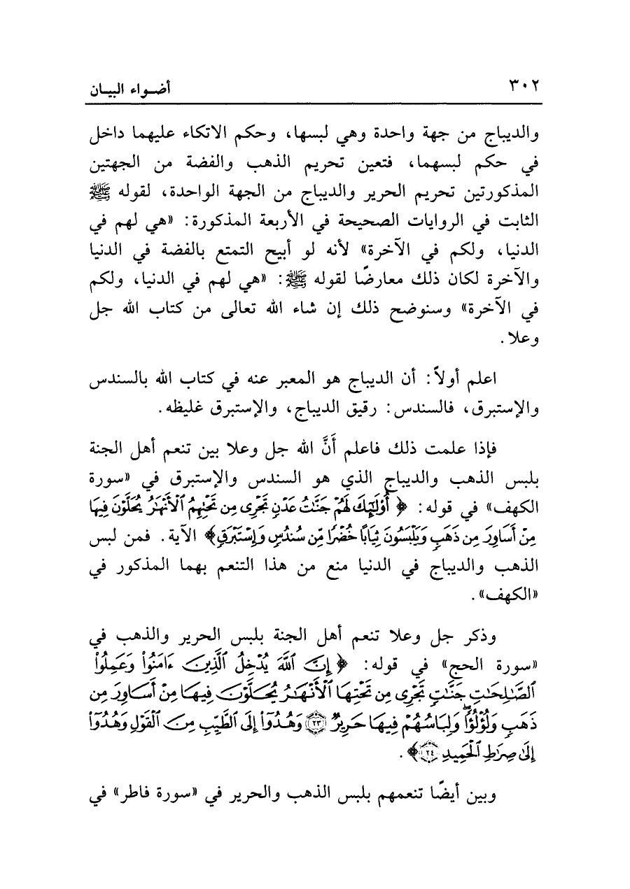 فإذا علمت ذلك فاعلم أَنّ الله جل وعلا بين تنعم أهل الجنة بلبس الذهب والديباج الذي هو السندس والإستبرق في "سورة الكهف" في قوله: {أُولَئِكَ لَهُمْ جَنَّاتُ عَدْنٍ تَجْرِي مِنْ تَحْتِهِمُ الْأَنْهَارُ يُحَلَّوْنَ فِيهَا مِنْ أَسَاوِرَ مِنْ ذَهَبٍ وَيَلْبَسُونَ ثِيَابًا خُضْرًا مِنْ سُنْدُسٍ وَإِسْتَبْرَقٍ} الآية. فمن لبس الذهب والديباج في الدنيا منع من هذا التنعم بهما المذكور في "الكهف".