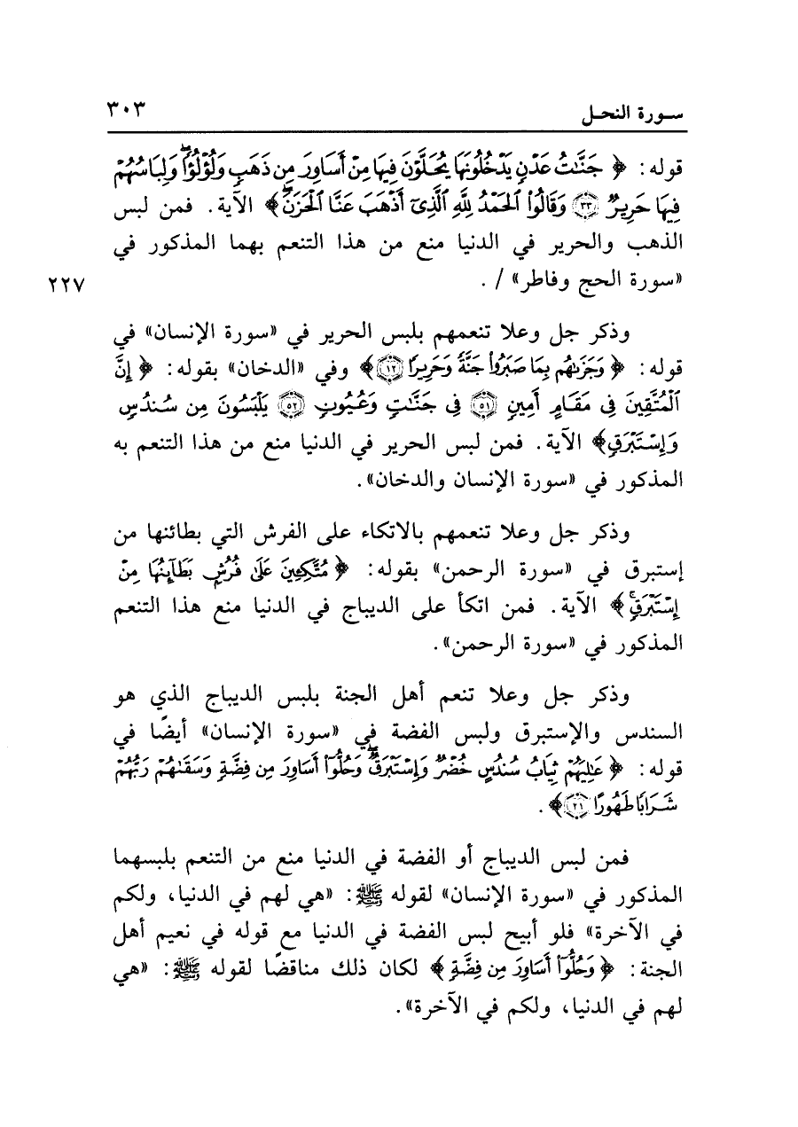 قوله: {جَنَّاتُ عَدْنٍ يَدْخُلُونَهَا يُحَلَّوْنَ فِيهَا مِنْ أَسَاوِرَ مِنْ ذَهَبٍ وَلُؤْلُؤًا وَلِبَاسُهُمْ فِيهَا حَرِيرٌ (٣٣) وَقَالُوا الْحَمْدُ لِلَّهِ الَّذِي أَذْهَبَ عَنَّا الْحَزَنَ} الآية. فمن لبس الَذهبَ والحرير في الدنيا منع من هذا التنعم بهما المذكور في "سورة الحج وفاطر".