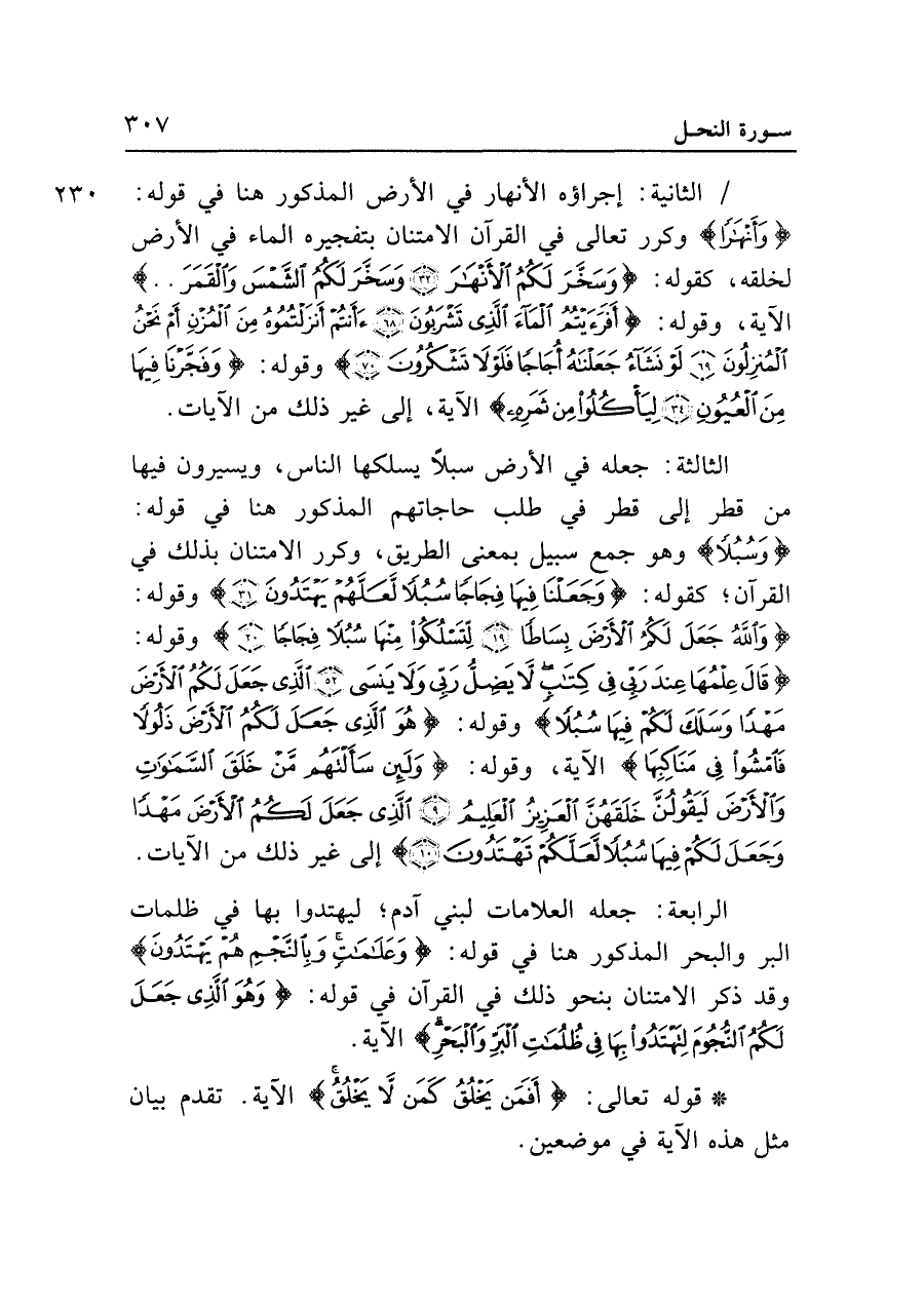 الثانية: إجراؤه الأنهار في الأرض المذكور هنا في قوله: {وَأَنْهَارًا} وكرر تعالى في القرآن الامتنان بتفجيره الماء في الأرض لخلقه، كقوله: {وَسَخَّرَ لَكُمُ الْأَنْهَارَ (٣٢) وَسَخَّرَ لَكُمُ الشَّمْسَ وَالْقَمَرَ ... } الآية، وقوله: {أَفَرَأَيْتُمُ الْمَاءَ الَّذِي تَشْرَبُونَ (٦٨) أَأَنْتُمْ أَنْزَلْتُمُوهُ مِنَ الْمُزْنِ أَمْ نَحْنُ الْمُنْزِلُونَ (٦٩) لَوْ نَشَاءُ جَعَلْنَاهُ أُجَاجًا فَلَوْلَا تَشْكُرُونَ (٧٠)} وقوله: {وَفَجَّرْنَا فِيهَا مِنَ الْعُيُونِ (٣٤) لِيَأْكُلُوا مِنْ ثَمَرِهِ} الآية، إلى غير ذلك من الآيات.